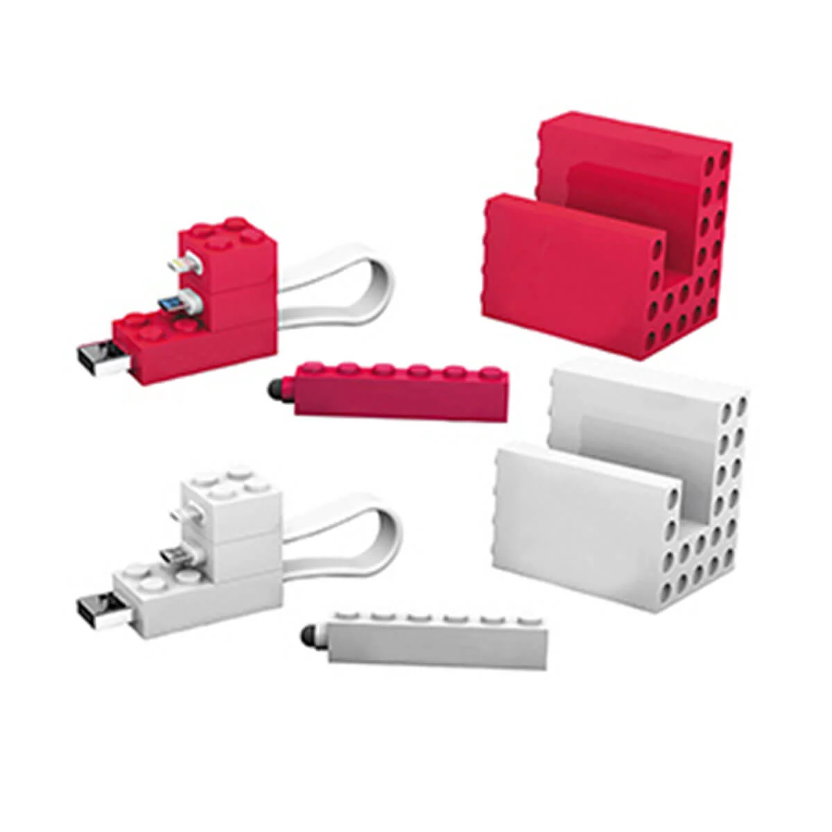 Office blocks 3 piece stationary set. Phone stand, stylus & mobile cable set with micro USB and lightening connectors. Available in 2 colours.