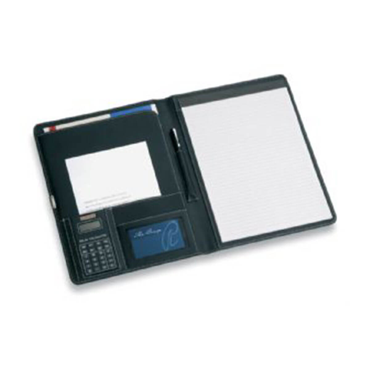 Upmarket pad cover made from polished Nappa leather with stylish silver stitching and metal badge.