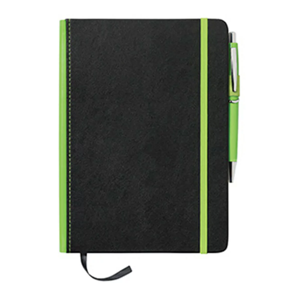 Trimmed with some colour down the spine this notebook has a built-in elastic closure, ribbon marker, pen loop & document pocket on inside back cover. Pen not included. Available in 4 colours.
