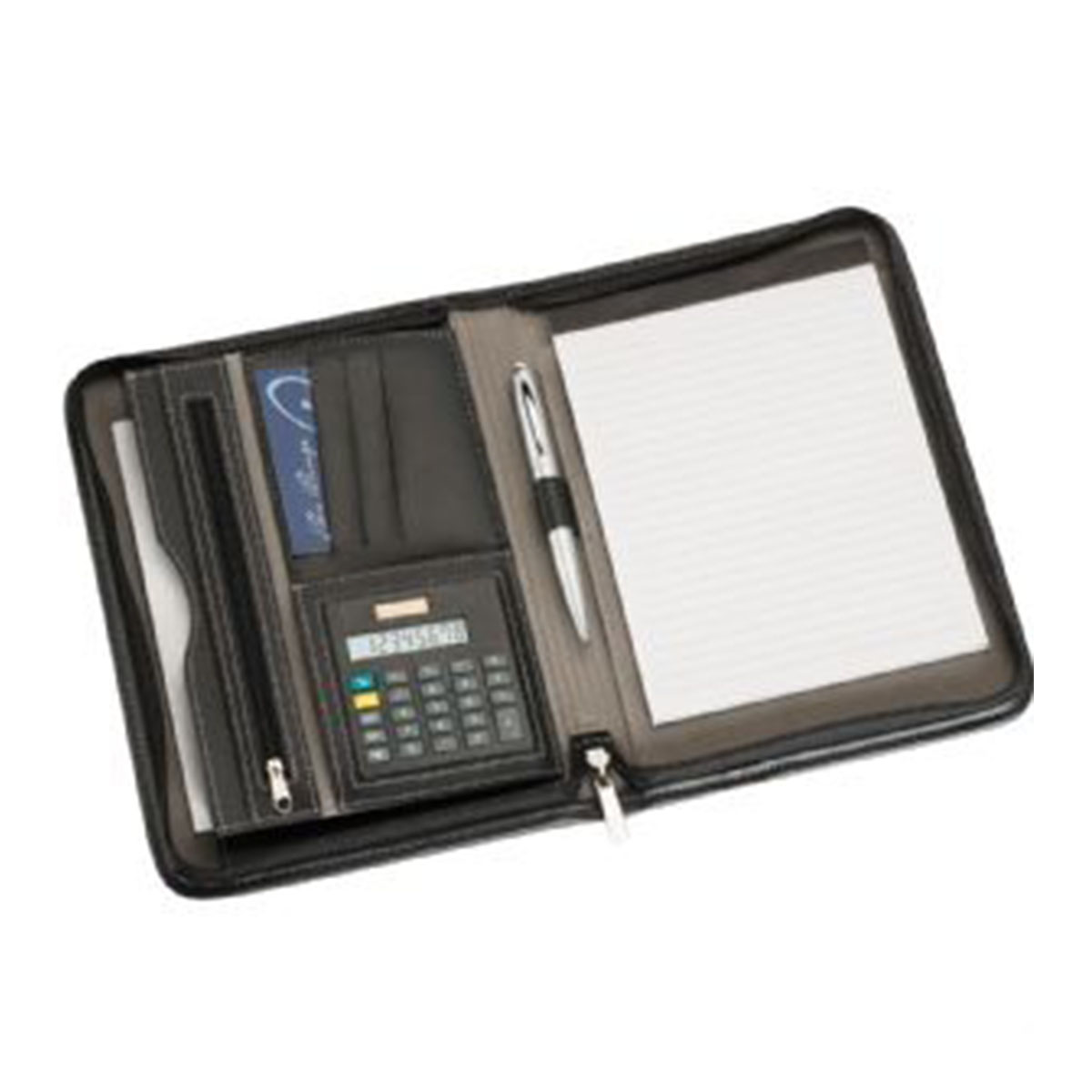 A5 size zippered compendium in koskin leather-look material with white contrast stitching and taupe coloured EVA material contrast panels inside.