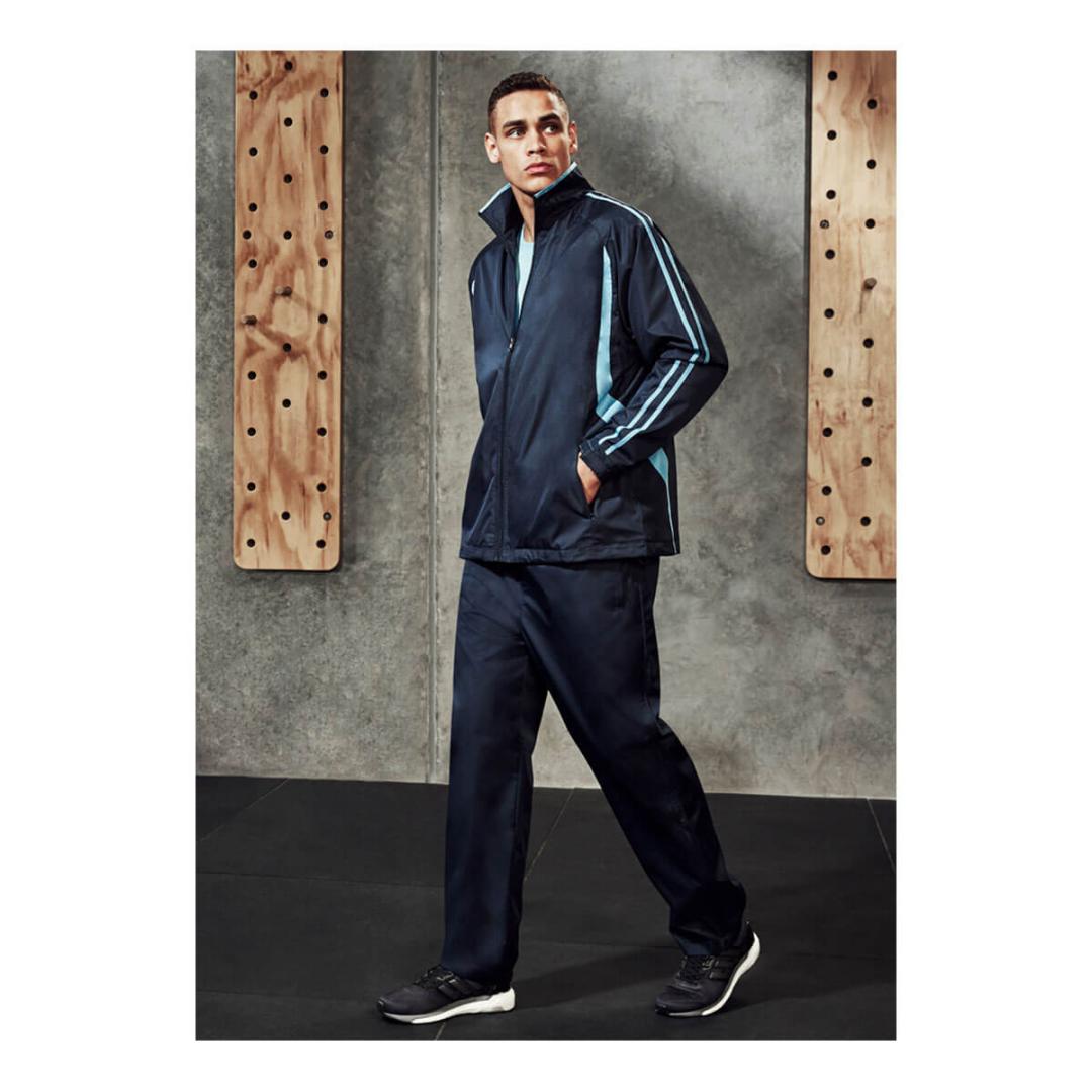 Outer: 100% Micro Fibre Jacquard Ripstop with Micro Fibre panels and piping detail Upper leg inner: Single jersey lining Lower leg inner: 100% Polyester Taffeta lining – Elasticated waist with drawstring 2 Open side pockets and back zipper pocket Bottom leg zipper to approximate knee height to allow pants to be pulled over boots/trainers