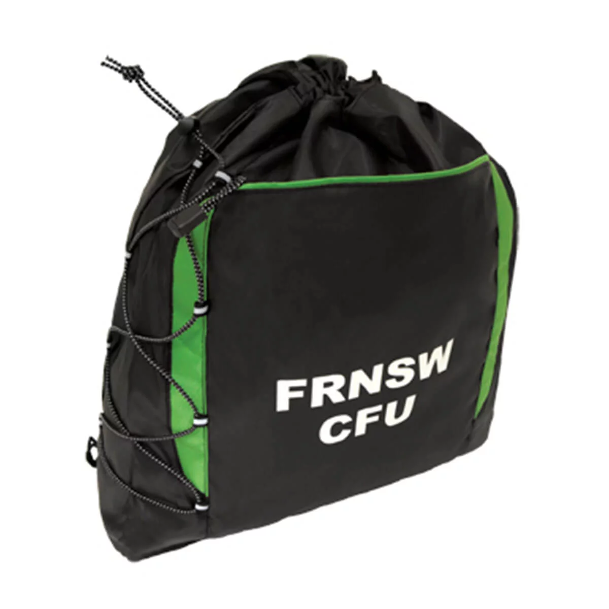 Drawstring closure, One large front zipper pocket, Elastic cord and toggle design on left hand side, V-Gusset with bottom width of 12cm Cords for use as over shoulder or backpack style carrying. Material – 210 denier nylon and textured nylon