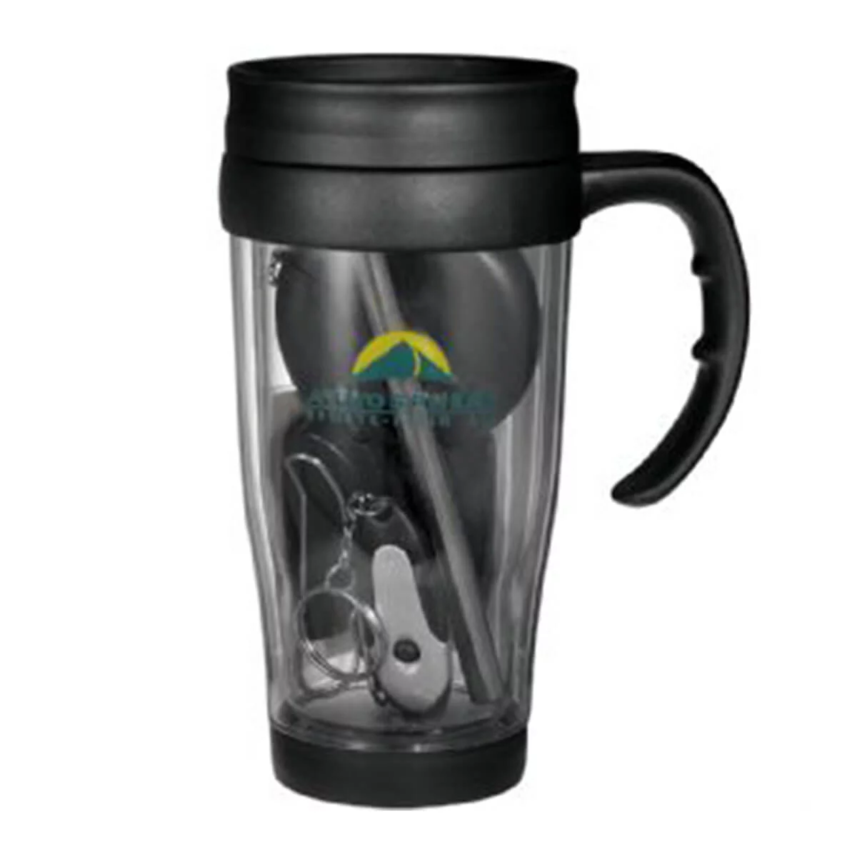 Six piece set including mug, coin holder, sunglass visor clip, key light (incl 1 x LR41 battery), non slip pad and tire gauge. All items supplied inside the drink holder.