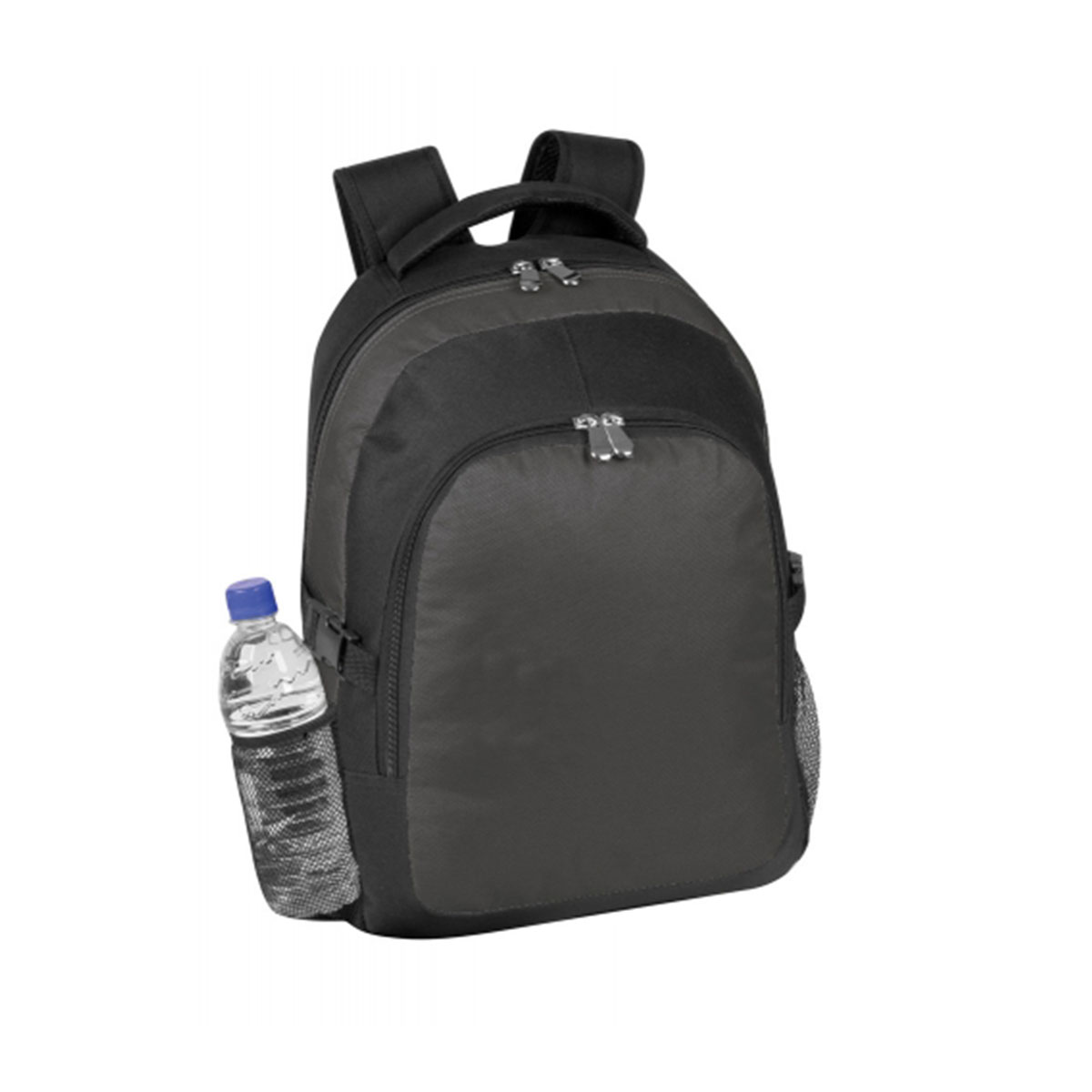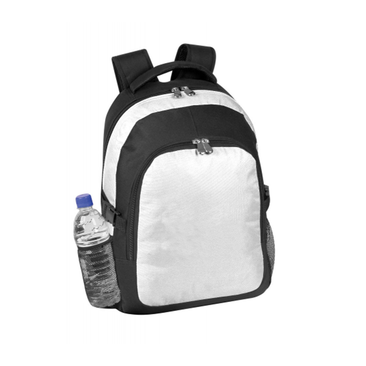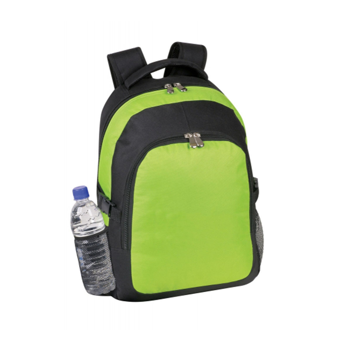 Main compartment with zipper clousre, Front zipper pocket, Support clip on both sides, Elasticised mesh pocket on both sides, Adjustable, padded straps with carry handle. Material – 600 Denier Nylon