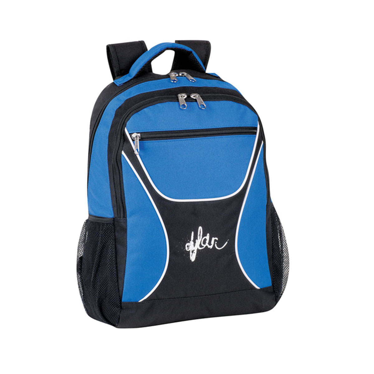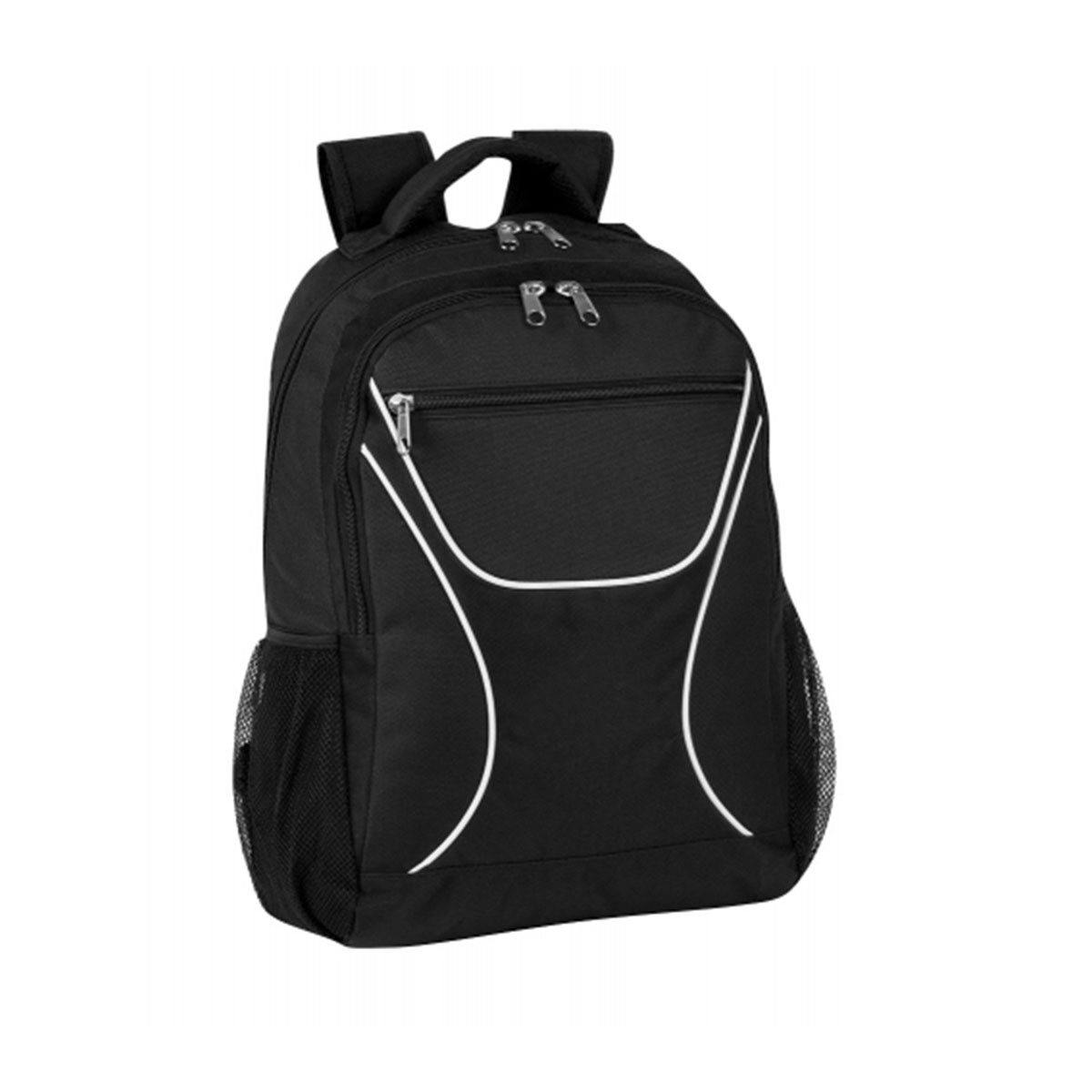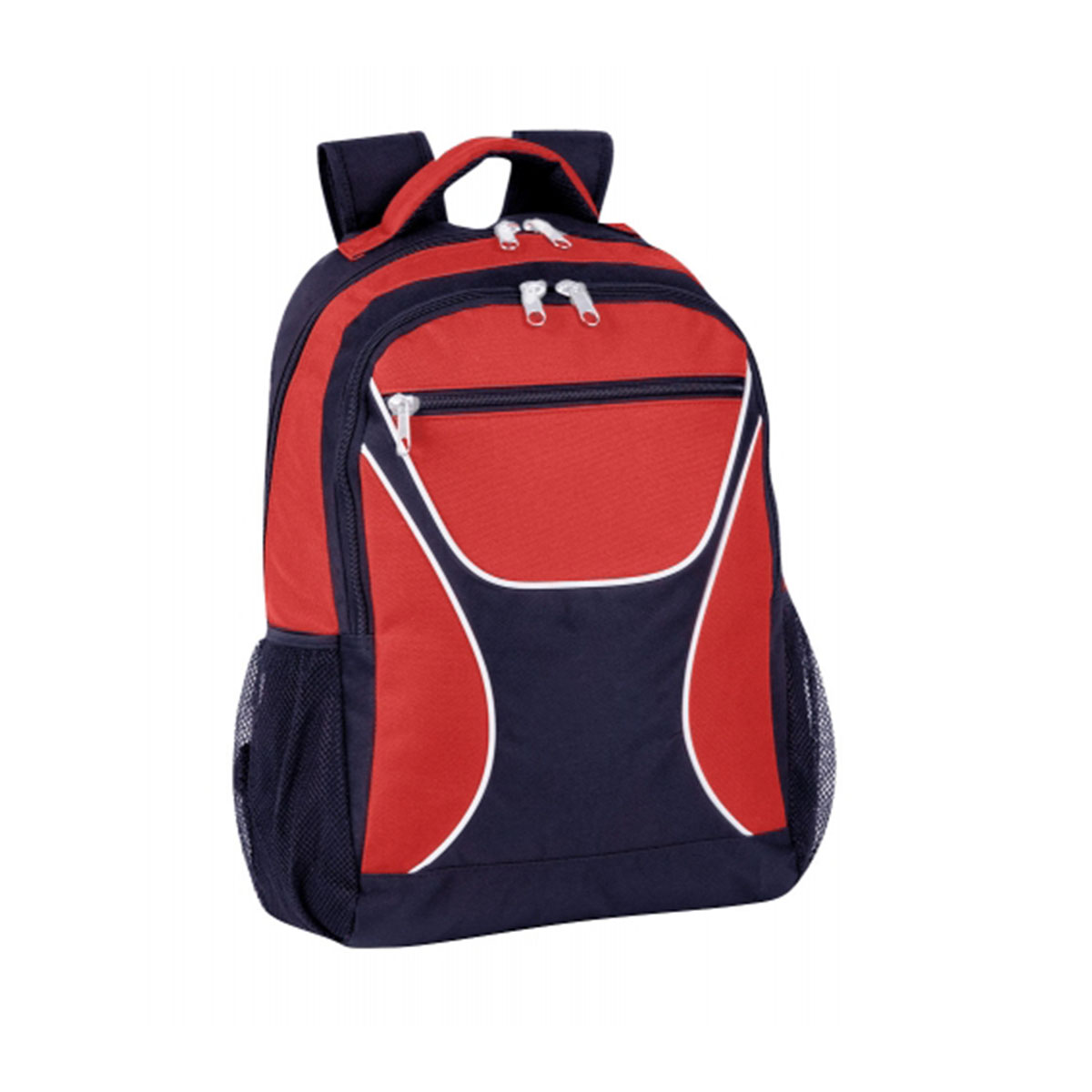 Main compartment with zipper closure, Front zipper pocket, Elasticised mesh pocket on both sides, Adjustable, padded straps with carry handle. Material – 600 Denier Nylon