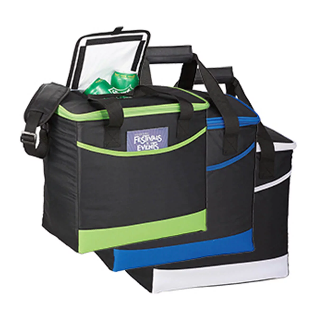 Zippered main compartment holds 36 cans. Easy access front pocket. Insulated leak proof PEVA lining. Main compartment capacity is approximately 25 litres.