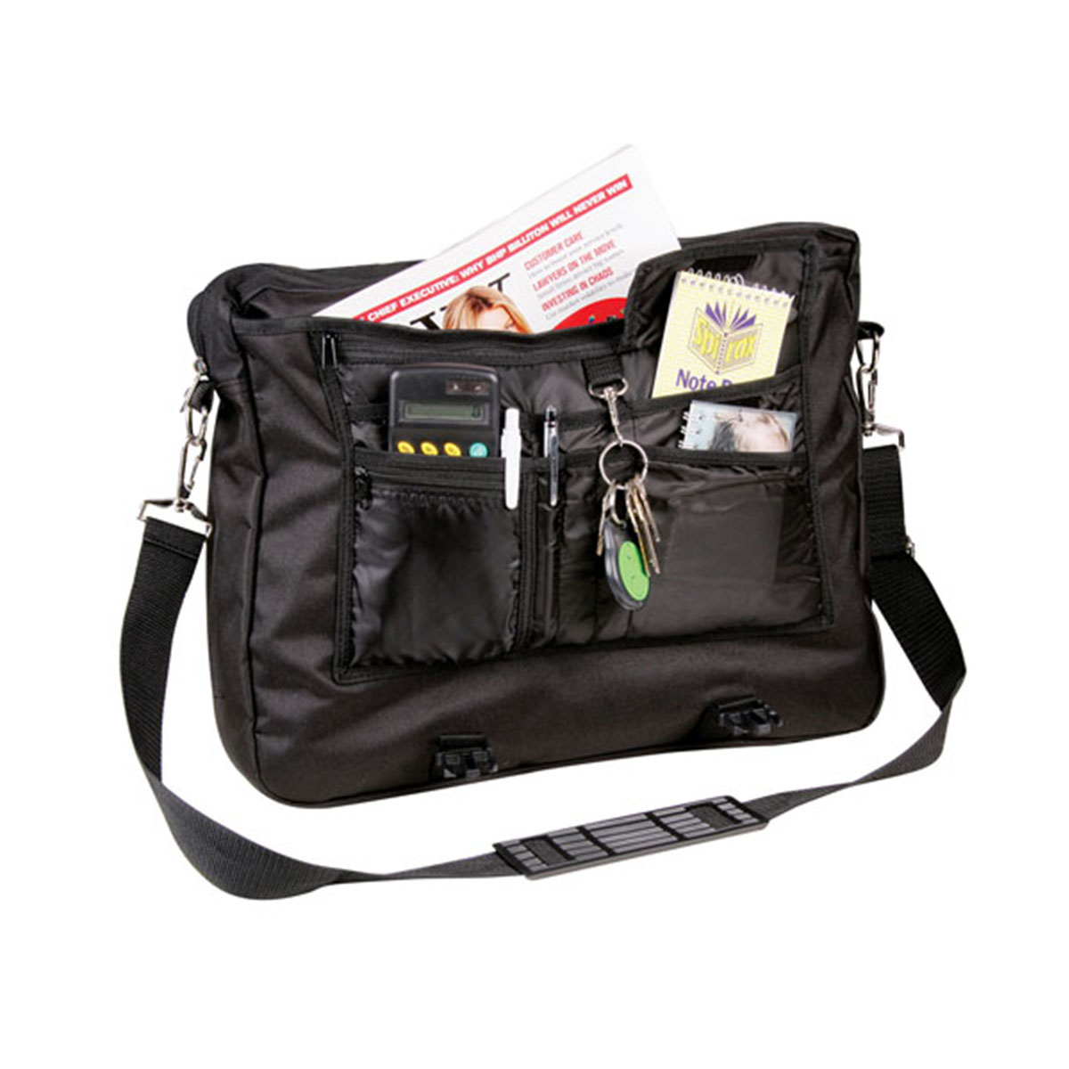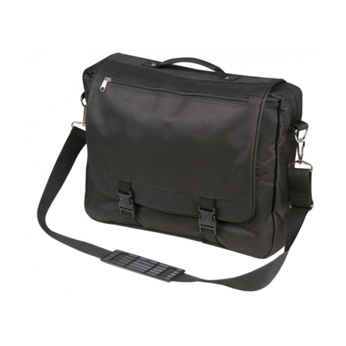 Front zippered pocket with 2 clip-on buckles, 2 zippered pocket, 1 fastener pocket and organiser under front flap, Zippered main compartment, Back zippered pocket with a business card holder, Adjustable webbed shoulder strap and carry handle, Suitable for notebook computer. Material – 600 Denier Nylon