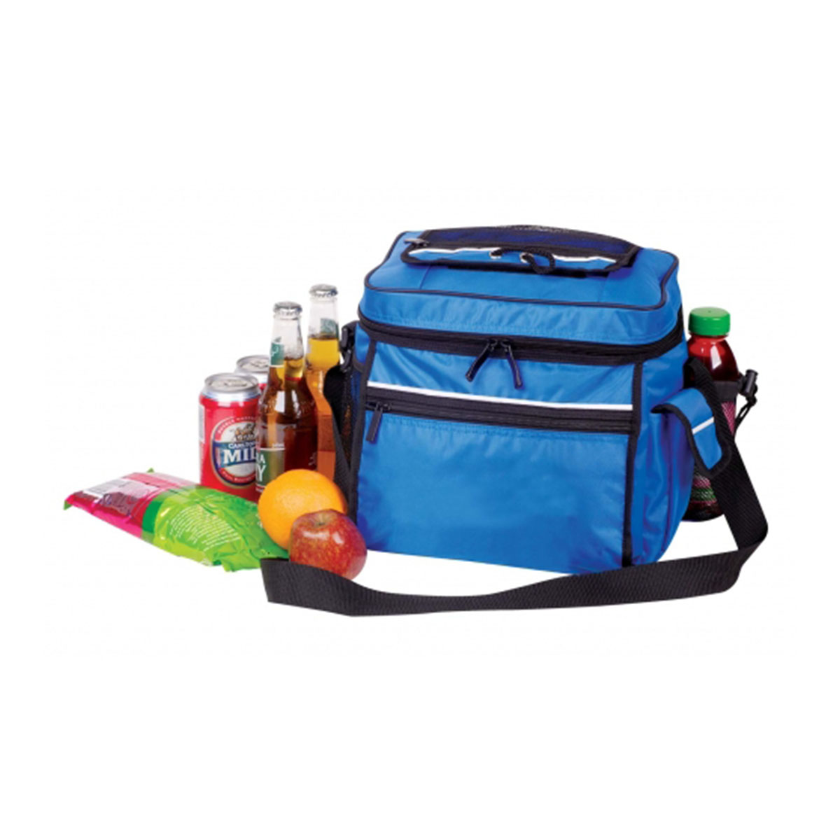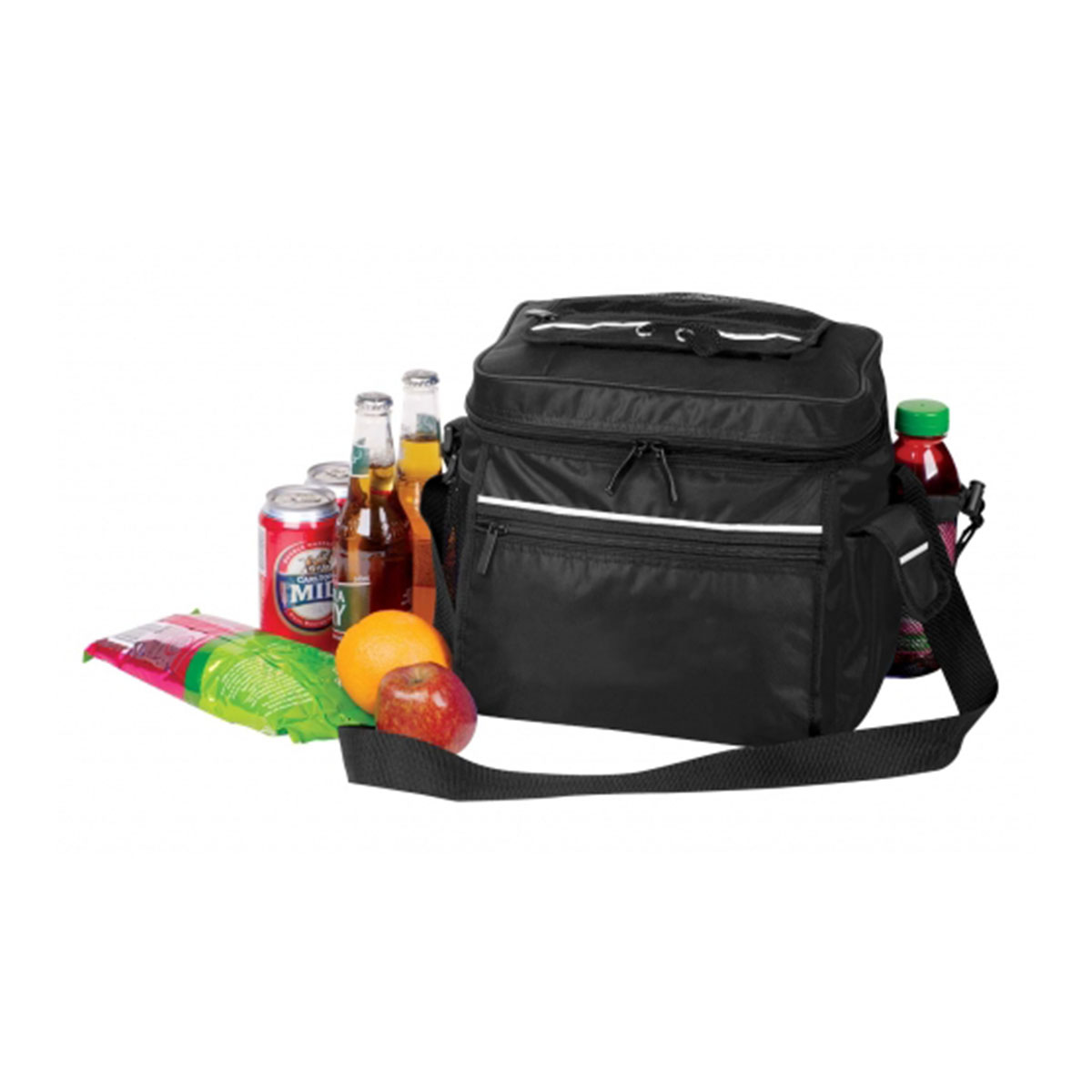 Main compartment with zipper closure, Velcro top open to main compartment with mesh zippered pocket, Front zippered pocket, Elasticised mesh pocket on one side, Velcro pocket and mesh puller closure pocket on one side, Adjustable shoulder strap. Material – 420 Denier Nylon with Dense Foam Insulation