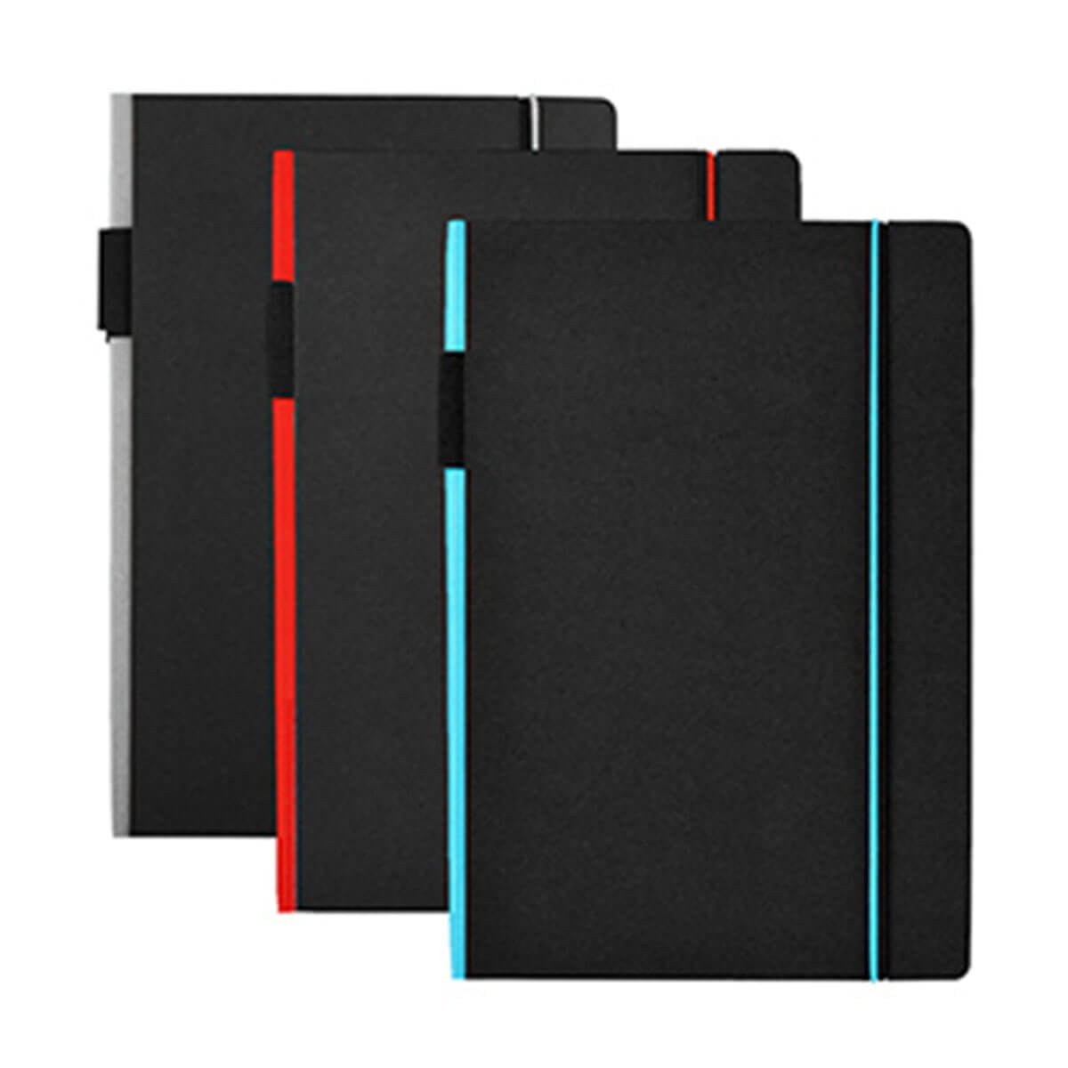 Exclusive design black hardcover notebook. The coloured spine and elastic closure add a touch of character which helps to distinguish it from others. Available in 3 colours.