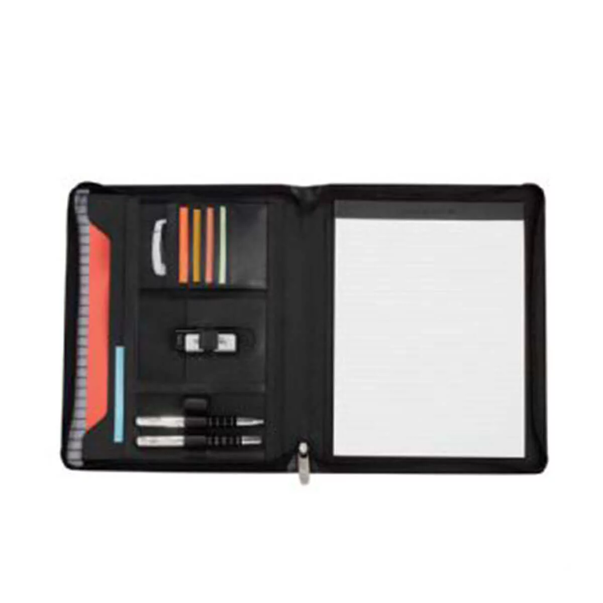 Genuine Nappa leather A4 zippered compendium, open front pocket, organiser includes gusseted file pocket, 3 pen loops, USB flash drive loop, 4 business card holders, PDA & phone holder and organisation pocket.