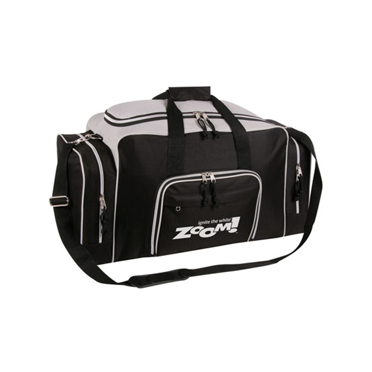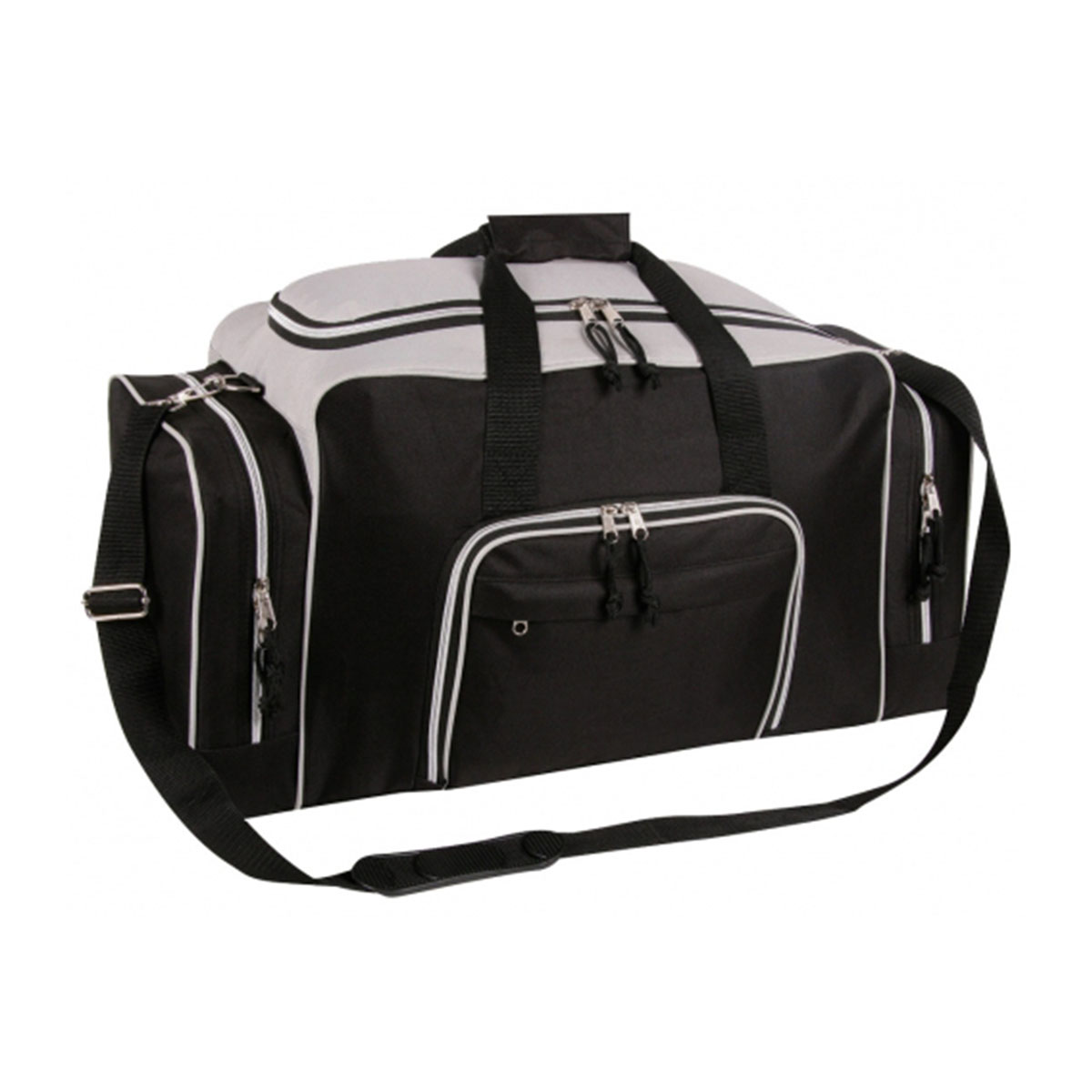 Large main compartment with double zip closure, 2 large zippered pockets at each end, Front zippered pocket, Detachable, adjustable shoulder strap. Material – 600 Denier Nylon