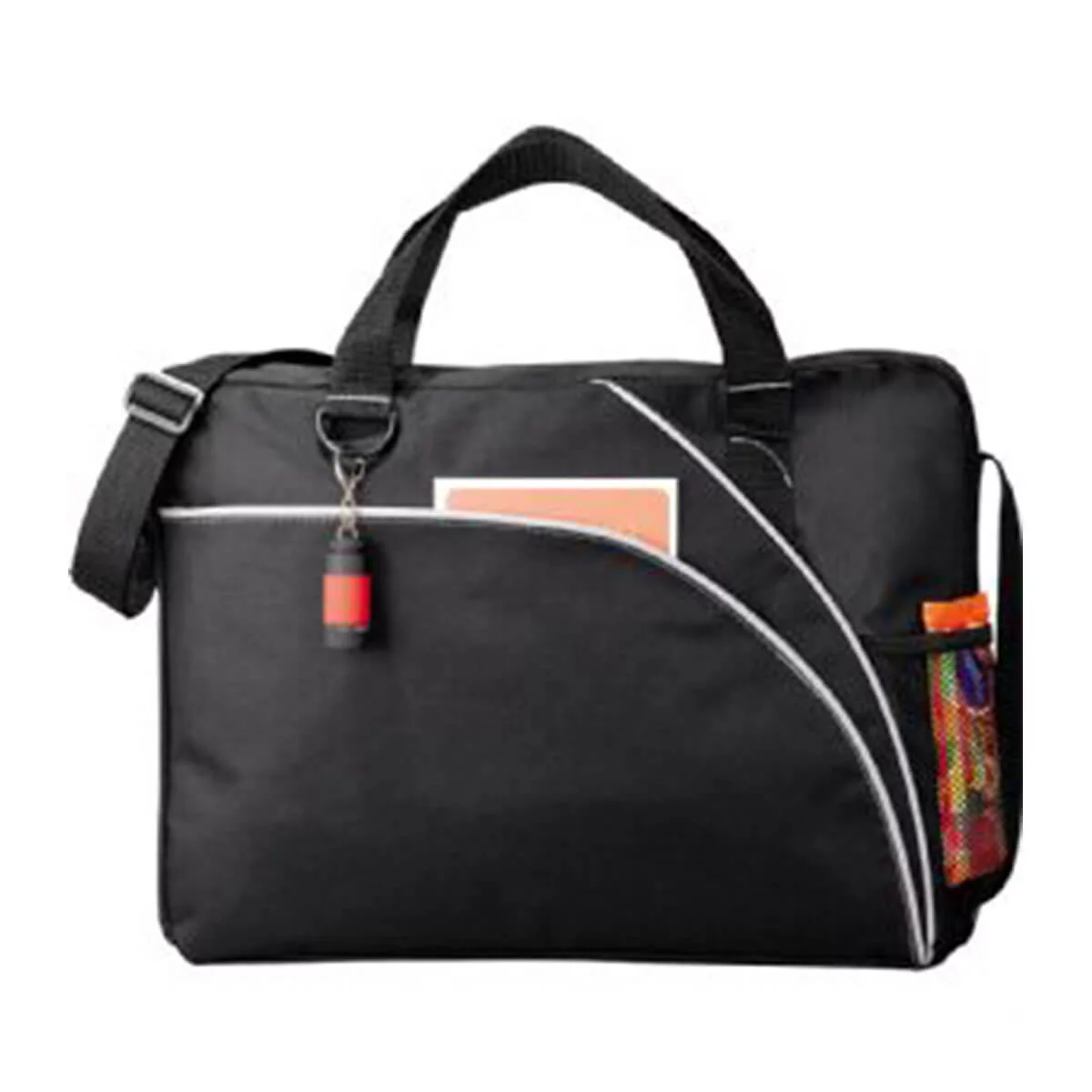 Zippered main pocket and easy access front Velcro pocket. Front pen loop and D-ring. Side mesh pocket. Adjustable shoulder strap and two carry handles. Made from 600D polycanvas and ripstop nylon in black. Supplied with business card stitched on bag.