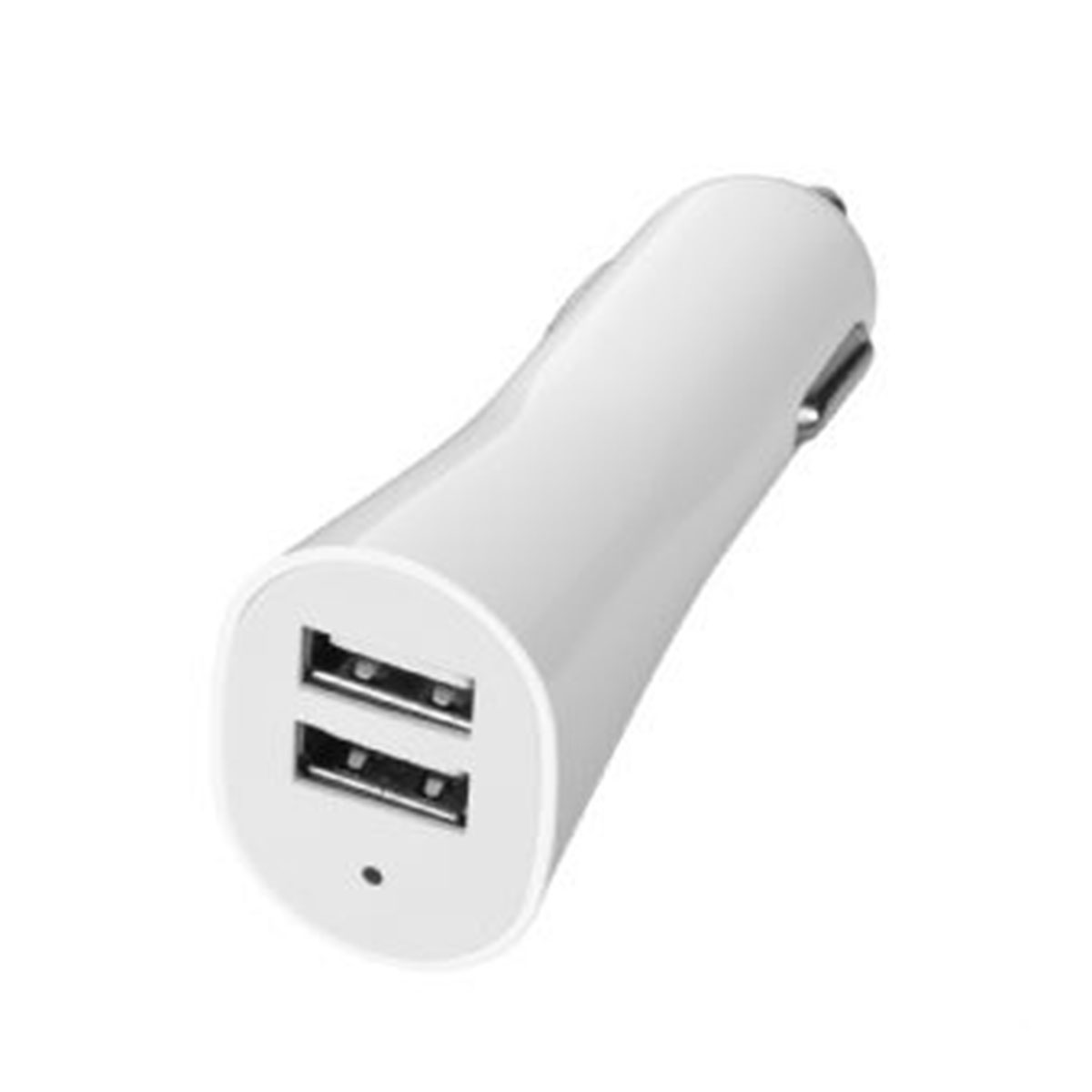 Dual auto plug adapter. Plug into power outlet to charge personal devices. USB output: 5 Volts / 2.0 Amps. ABS plastic.