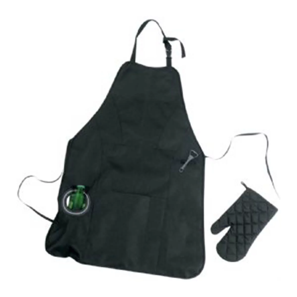 Includes an apron, detachable bottle opener, padded oven mitt, accessory front pocket, beverage holder pocket to rest a can or bottle for the thirsty master chefs.