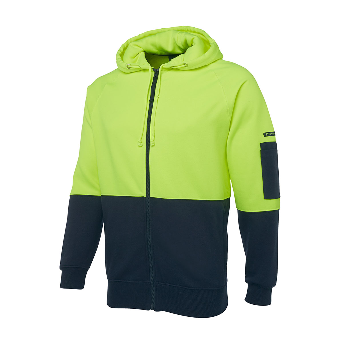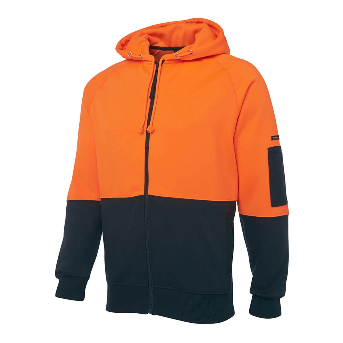 80% Polyester for durability, and 20% Cotton for comfort,280gsm fleece fabric,Complies with Standards AS/NZS 1906.4:2010 AS/NZS 4602.1:2011 Day Only,Contrast panel at body and sleeves,Rib basque sleeve cuffs for improved durability,Two front pockets and pen pocket on sleeve,Easy care fabric,hood with drawcord