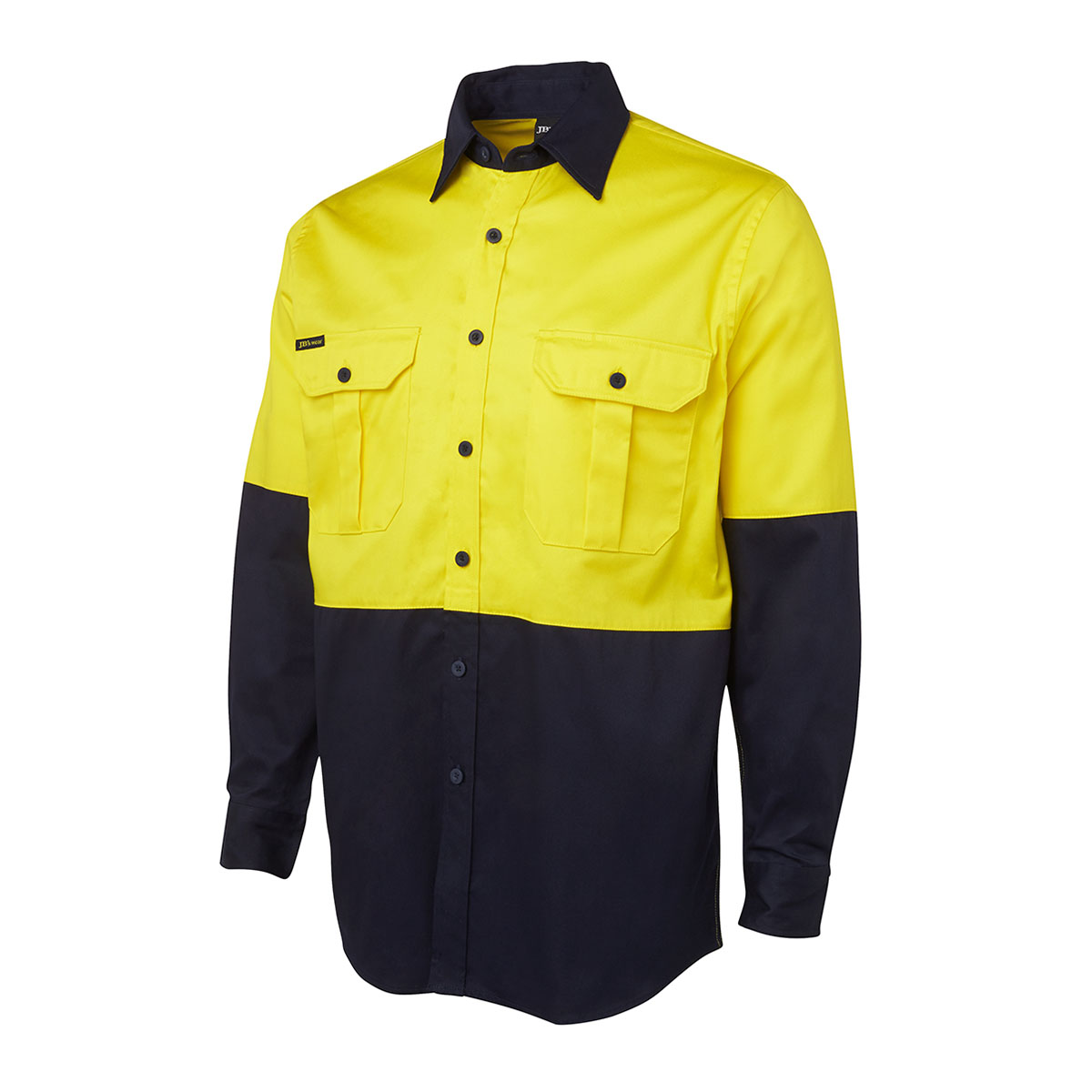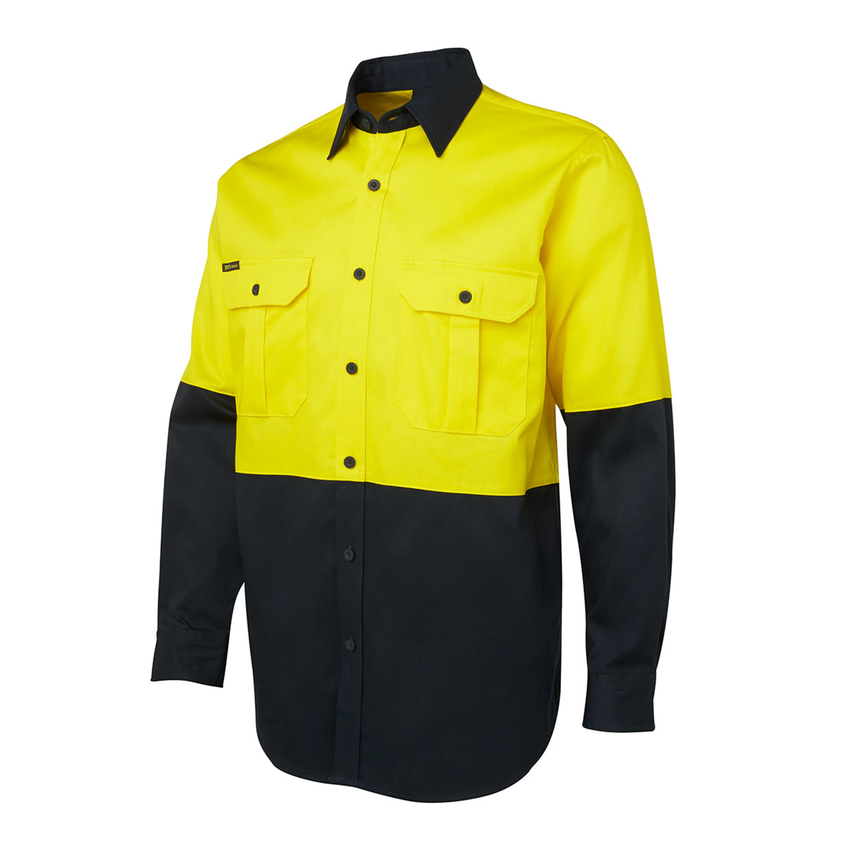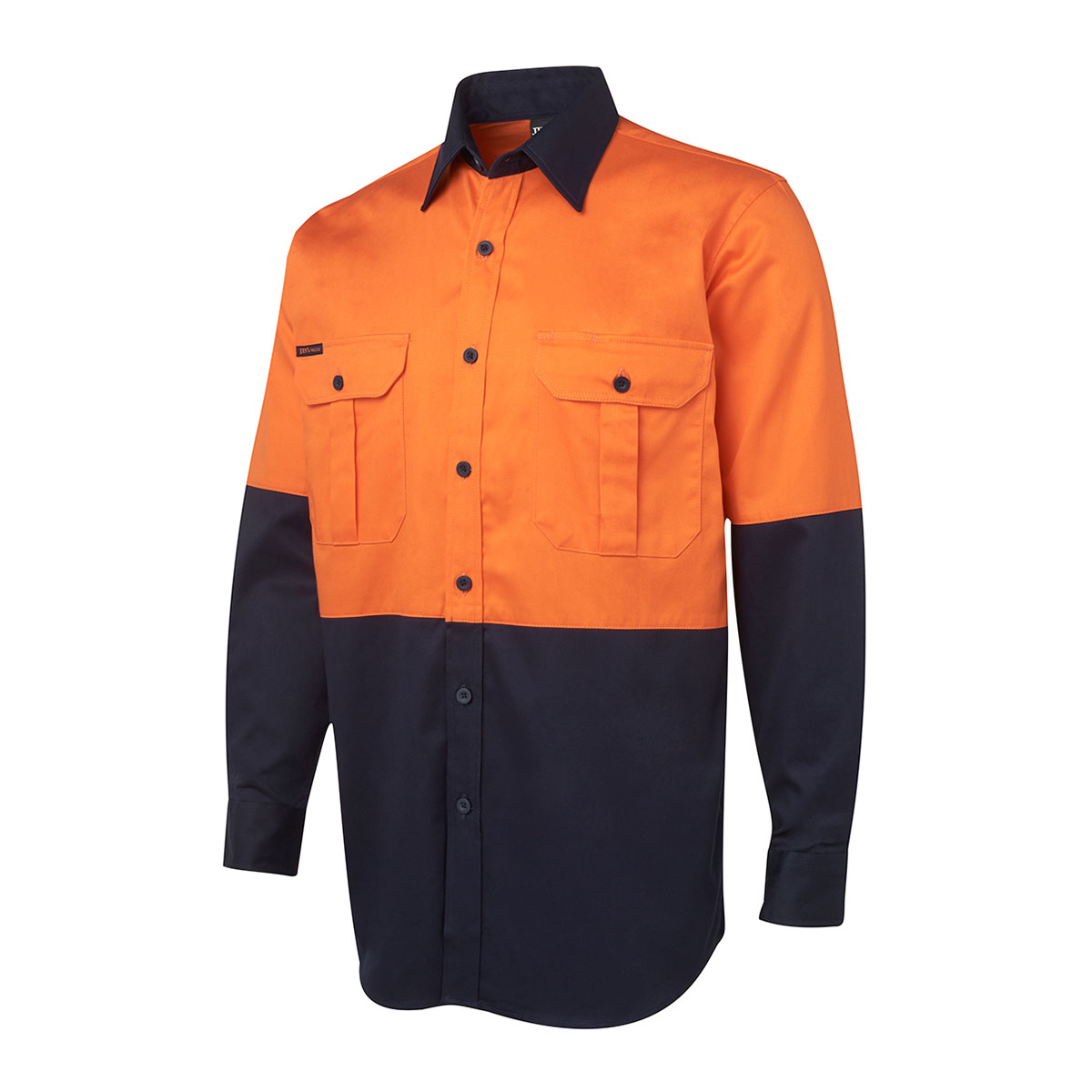100% Cotton for 100% comfort,190gsm double pre-shrunk twill,Complies with Standard AS/NZS 4399:1996 for UPF Protection,Complies with Standards AS/NZS 1906.4:2010 AS/NZS 4602.1:2011 Day Only,Two-piece collar,Two front pockets with button-down flaps and pen insert,Curved hem with back tail styling,2 needle lap seamed for improved durability,All pressure points bar tacked for extra strength and durability