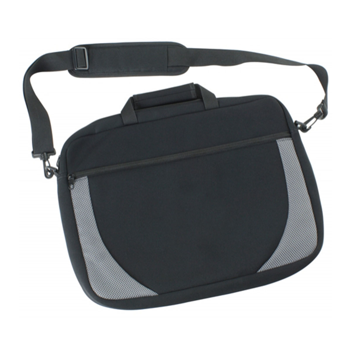 2 large padded compartments with zipper closure, Front zippered pocket, Business card holder on back, Adjustable webbed shoulder strap and padded carry handle, Suitable for notebook computer. Material – Neoprene with Waffle Mesh