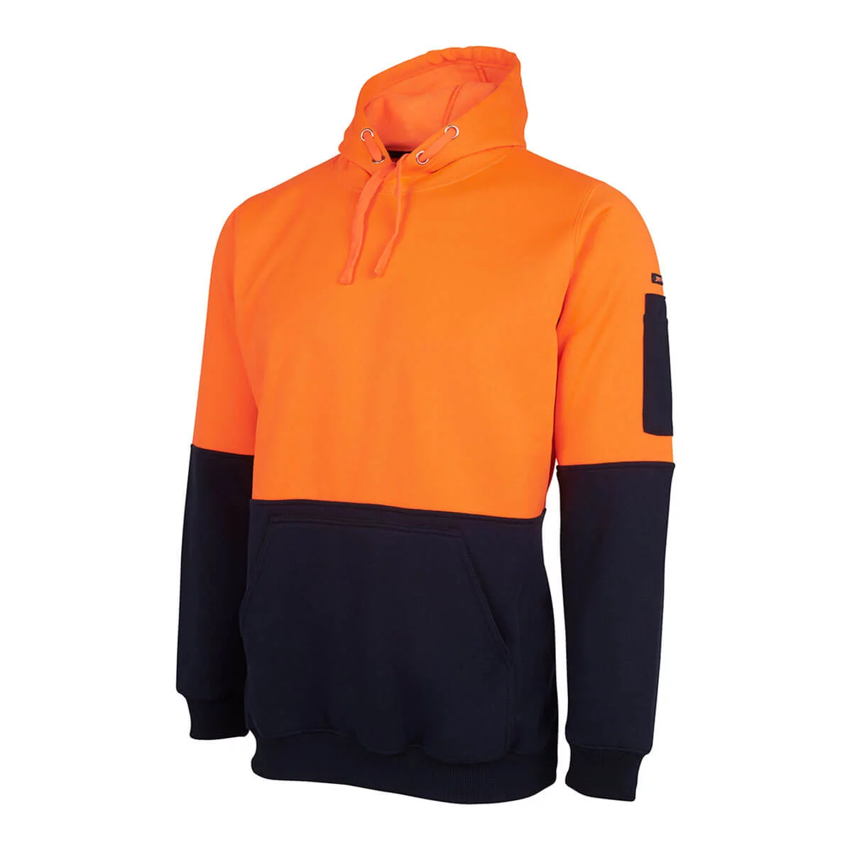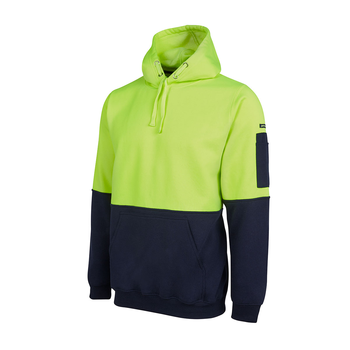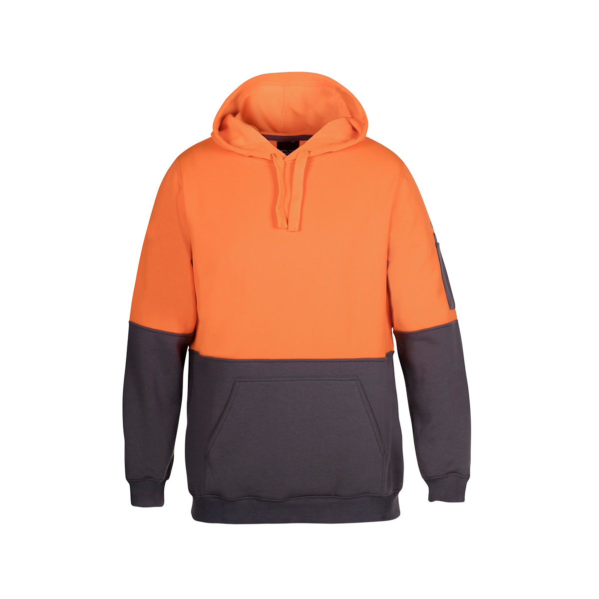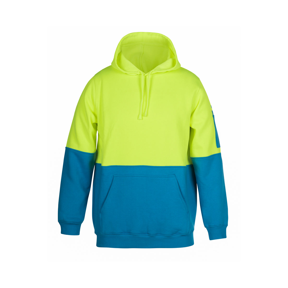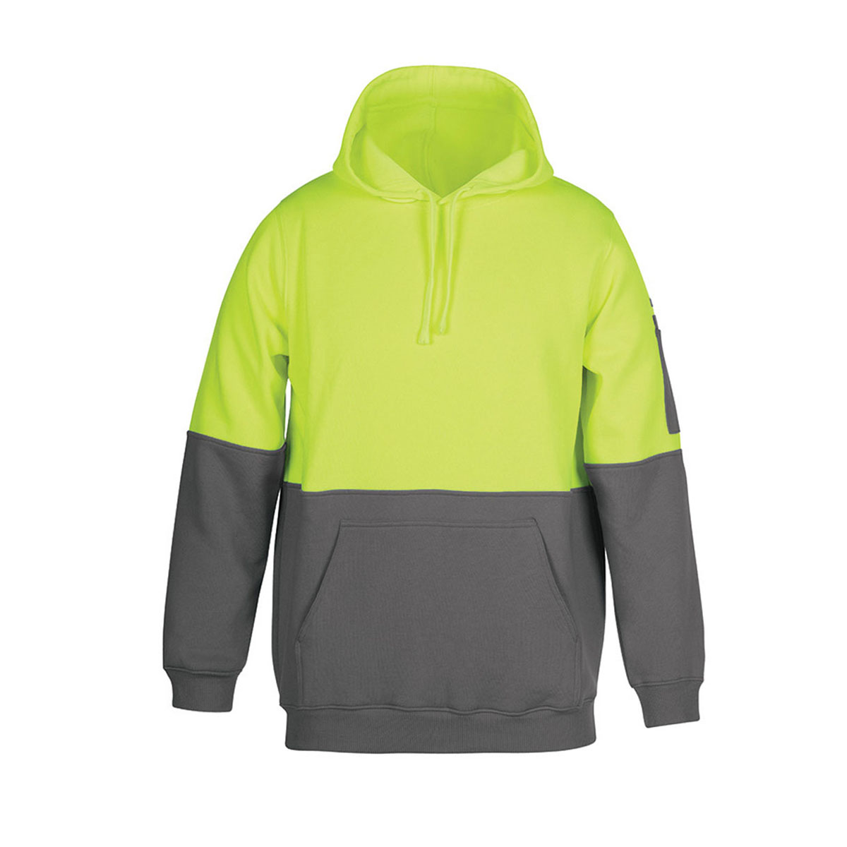 80% Polyester for durability, 20% Cotton for comfort,280gsm Fleece Fabric,Contrast panel at body and sleeves,Rib basque sleeve cuffs and bottom hem for improved durability,Kangaroo pocket on C.F and pen pocket on sleeve,Complies with AS/NZS 1906.4:2010 and AS/NZS 4602.1:2011 Day Only,Hood with drawcord,Easy care fabric