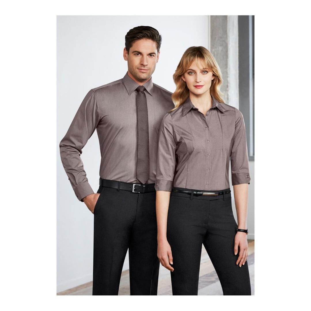 70% Cotton, 26% Polyester, 4% Elastane Stretch Fabric – Yarn dyed fine stripe Easy iron wrinkle free liquid treated fabric – Shaped side panels with subtle front yoke panel feature and slight curved hem Adjustable button cuffs