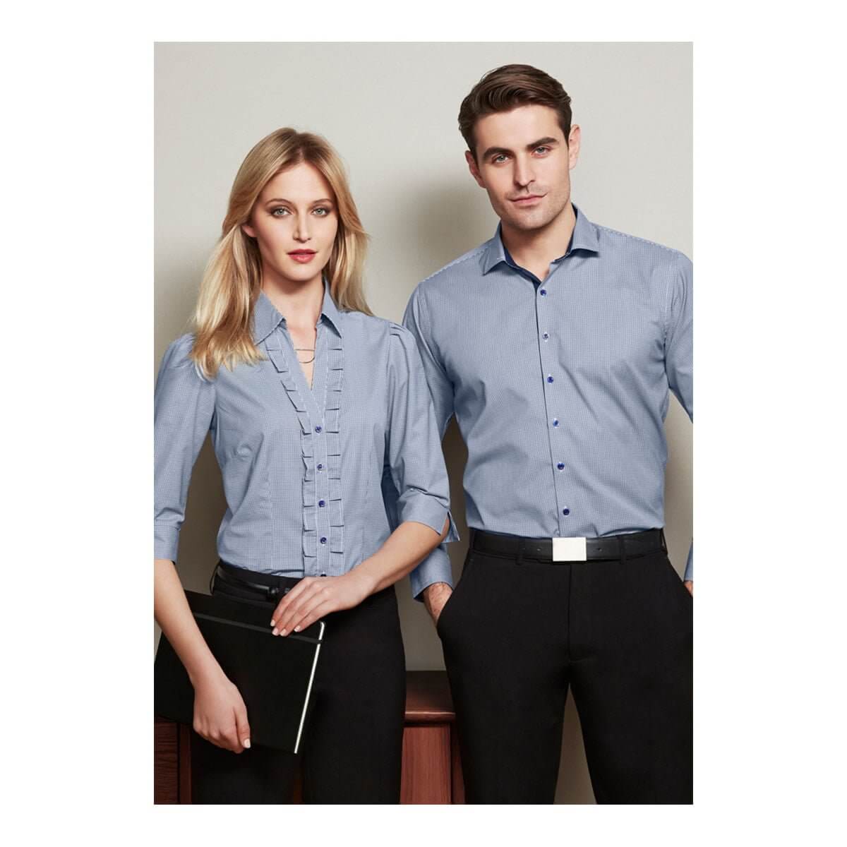55% Polyester, 45% Cotton Yarn dyed check with mechanical stretch – Y-line placket with unique fashion pleat detail Waist and bust darts for elegant shape