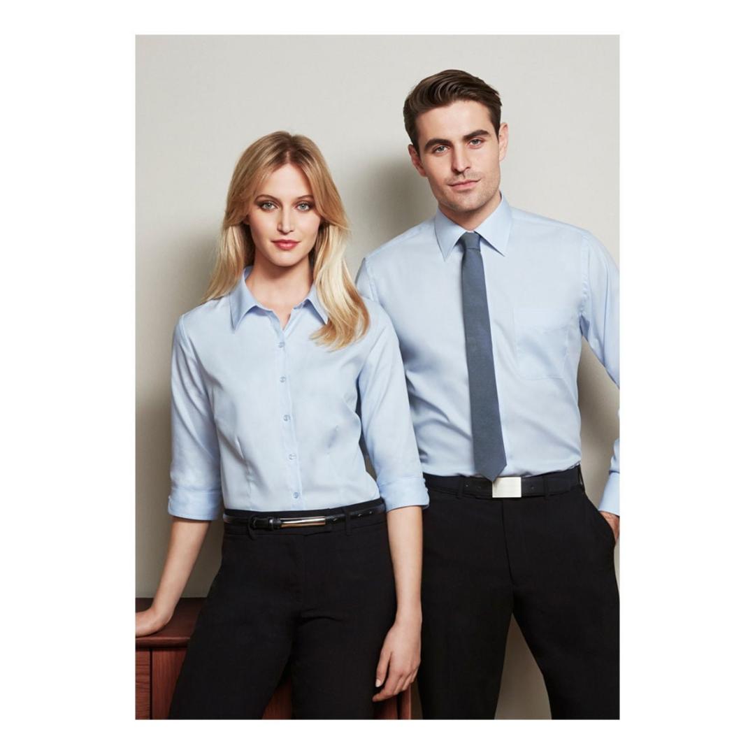 100% Cotton Mini Herringbone fabric Easy iron wrinkle free liquid treated fabric – Cuff detail with buttons Waist and bust darts for shape Available in Blue or White