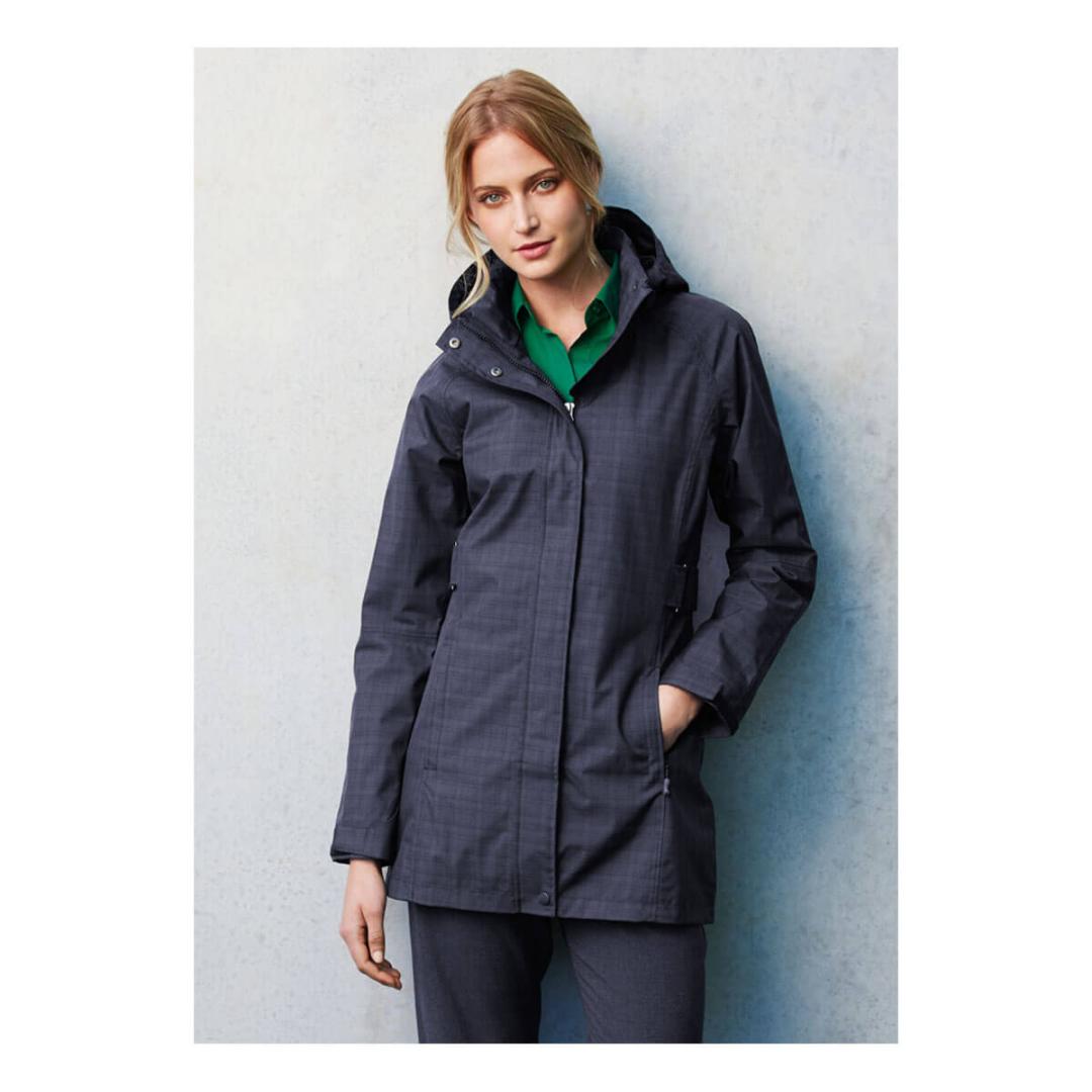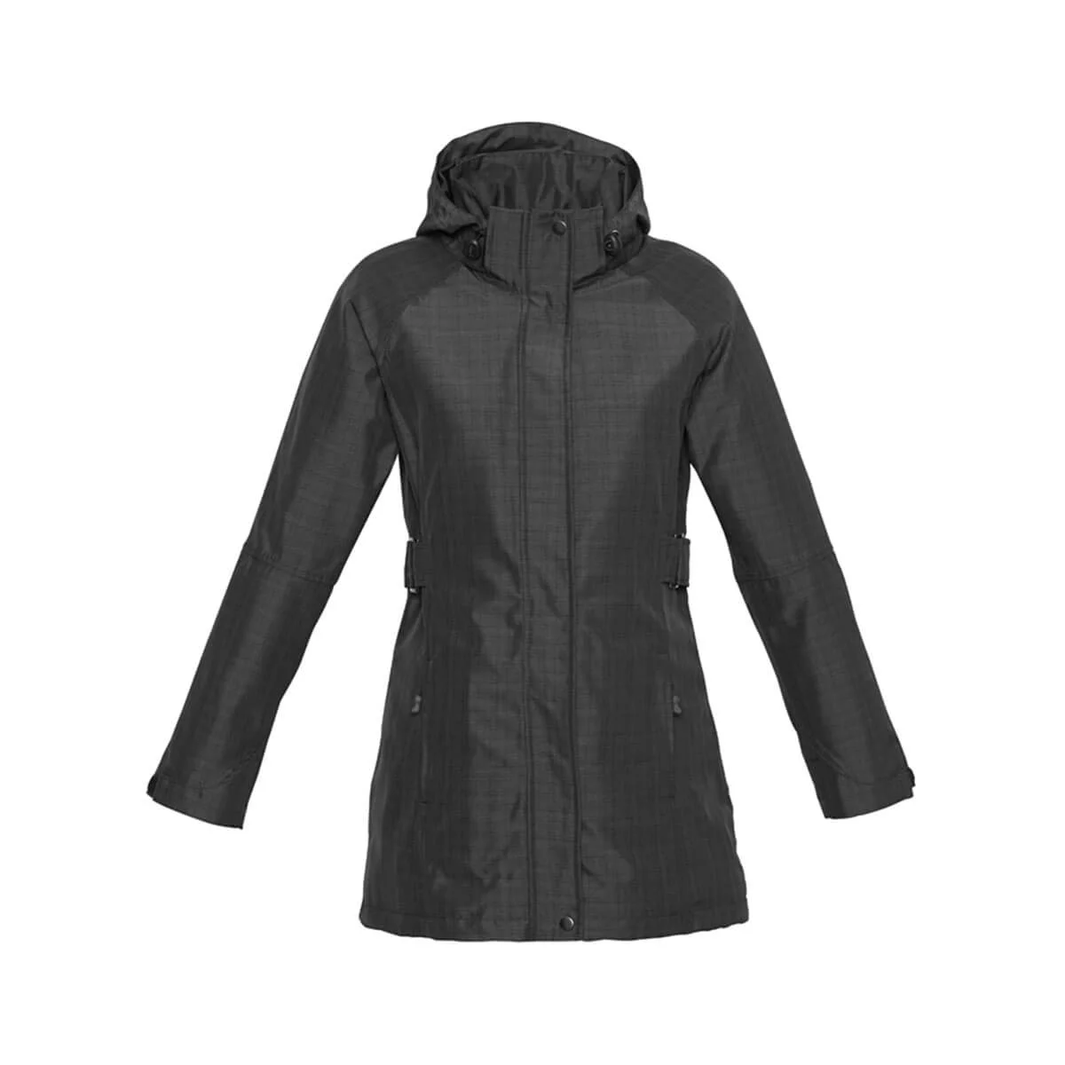 Outer: Seam-sealed 100% Polyester shell Lining: 100% Polyester Brushed fabric Subtle crosshatch fabric pattern – Detachable, fully lined hood Stand up collar with soft chin guard Inside chest pocket, audio port access Side zippered pockets Adjustable cuff with tab closure Longline with adjustable waist buckles for shape and a 2-way waterproof front zip with storm flap Internal embroidery access|COLOURS|Available in Graphite only|BIZ TECH TECHNOLOGY FEATURES Water Repellent rating – 6000mm inner membrane Breathability rating – 1500g/m² Windproof