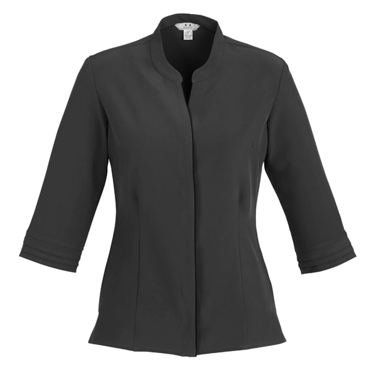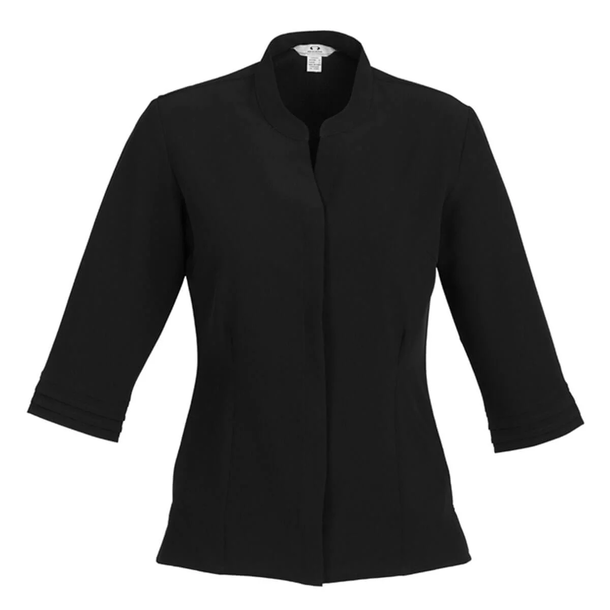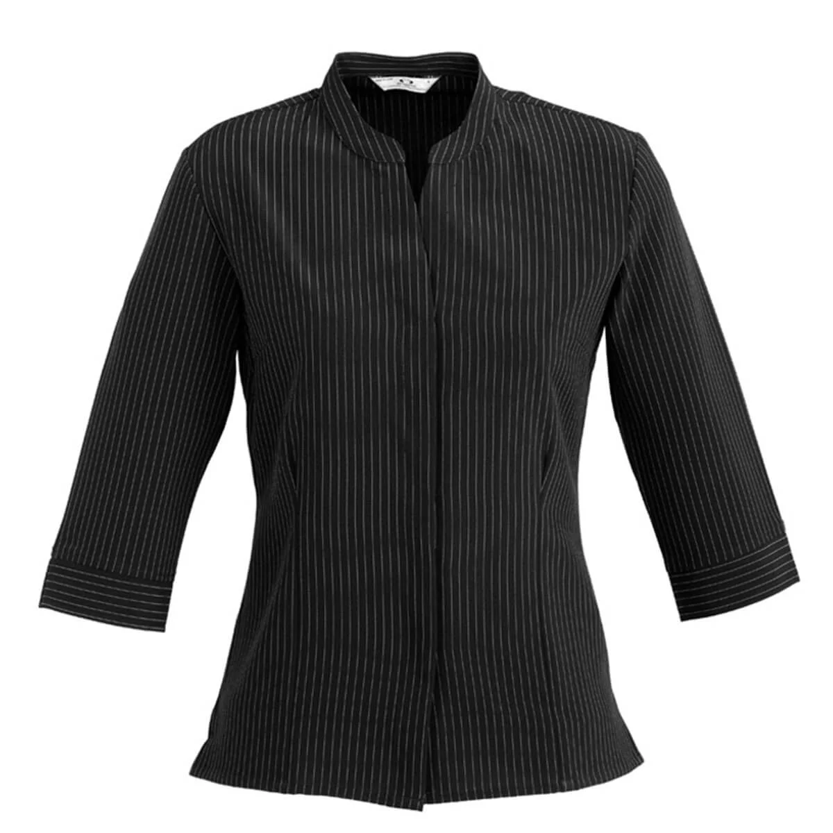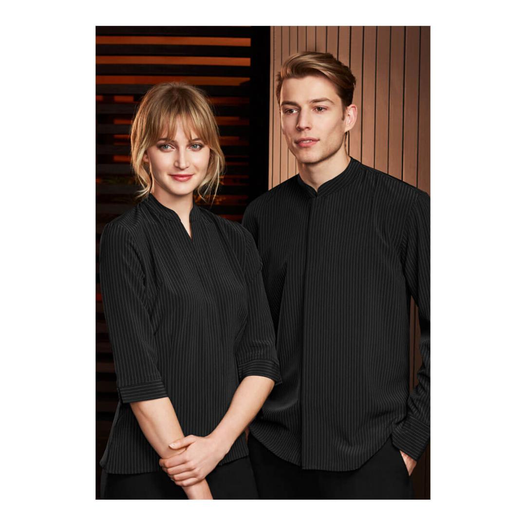 Stretch easy care, Teflon® stain release fabric Black and Charcoal: 95% Polyester, 5% Elastane Black/White: 93% Polyester, 5% Elastane, 2% Viscose Yarn dyed stripe (Black/White only) – Open neckline with concealed button placket Waist and bust darts for shape Straight hemline with side splits for comfort Sleeve cuff pleat detail on Black and Charcoal only