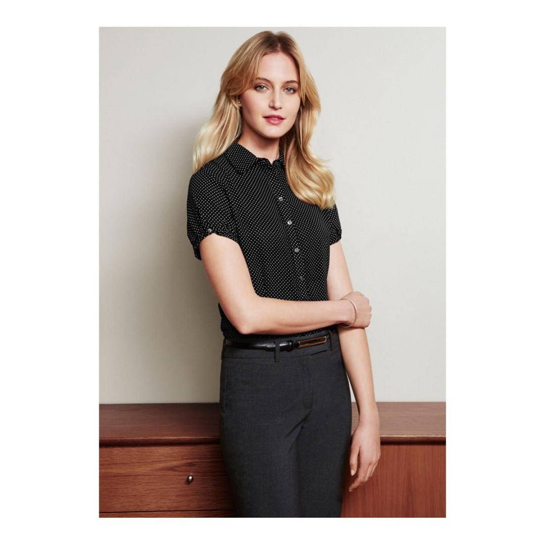 100% Easy Care Woven Polyester – Centre back gathered pleat detail for movement Buttoned sleeve opening with elasticated gathers for comfort Waist and bust darts for shape Curved hemline – can be worn tucked in or out