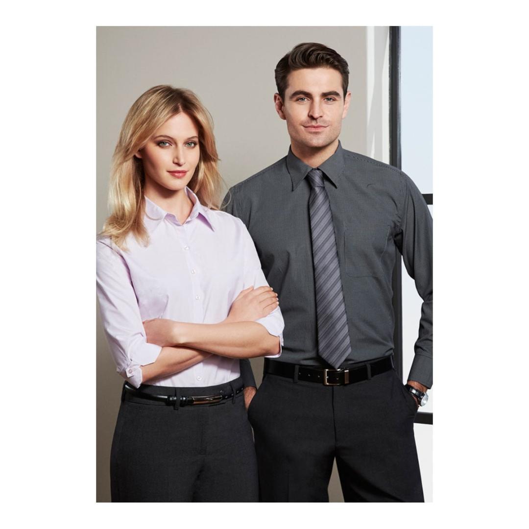 75% Polyester, 25% Cotton Yarn dyed fine check fabric UPF rating – Excellent – Stylish button cuff detail and curved hem with bust and waist darts for semi-tailored fitting