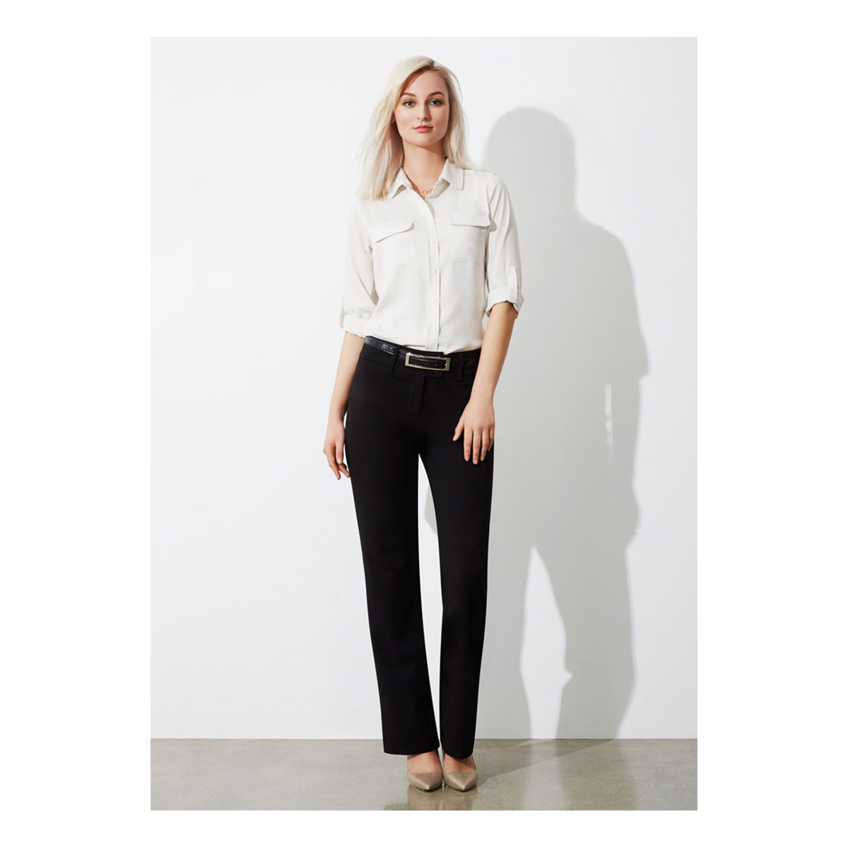 4-way Stretch Comfort 62% Polyester, 34% Viscose, 4% Elastane – Mid-rise with a flattering wider waistband Low profile front and back pockets Classic straight leg shape Finished inseam length: 82cm