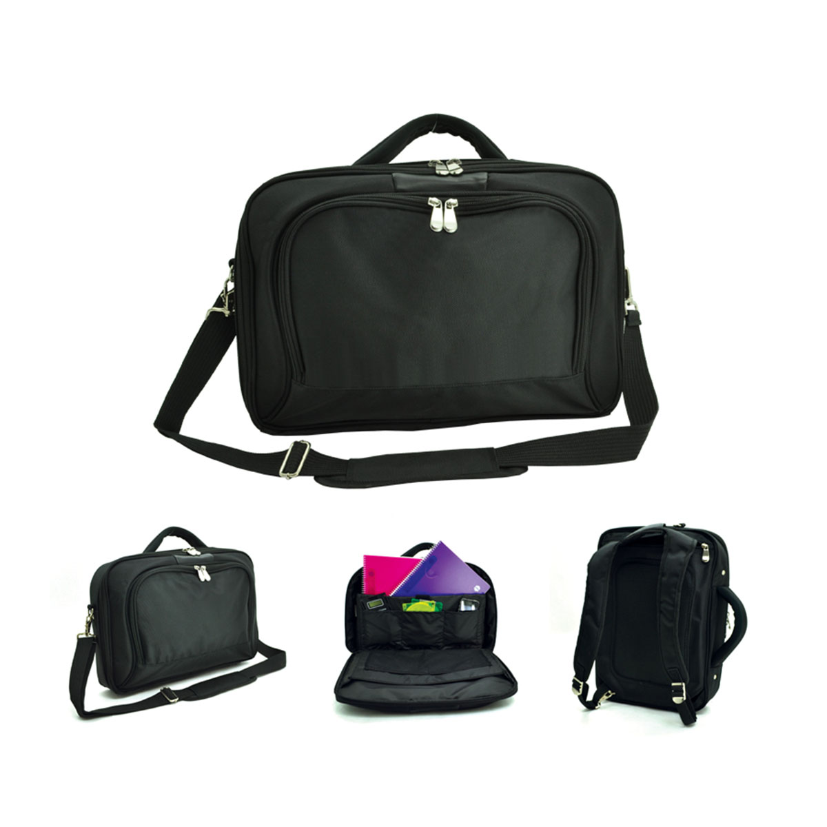 Main zippered compartment with inside padded laptop holder, Large front zippered pocket with inside pouch and pen holders, Hideaway and adjustable backpack strap, Adjustable and detachable shoulder strap. Material – 1200 denier nylon