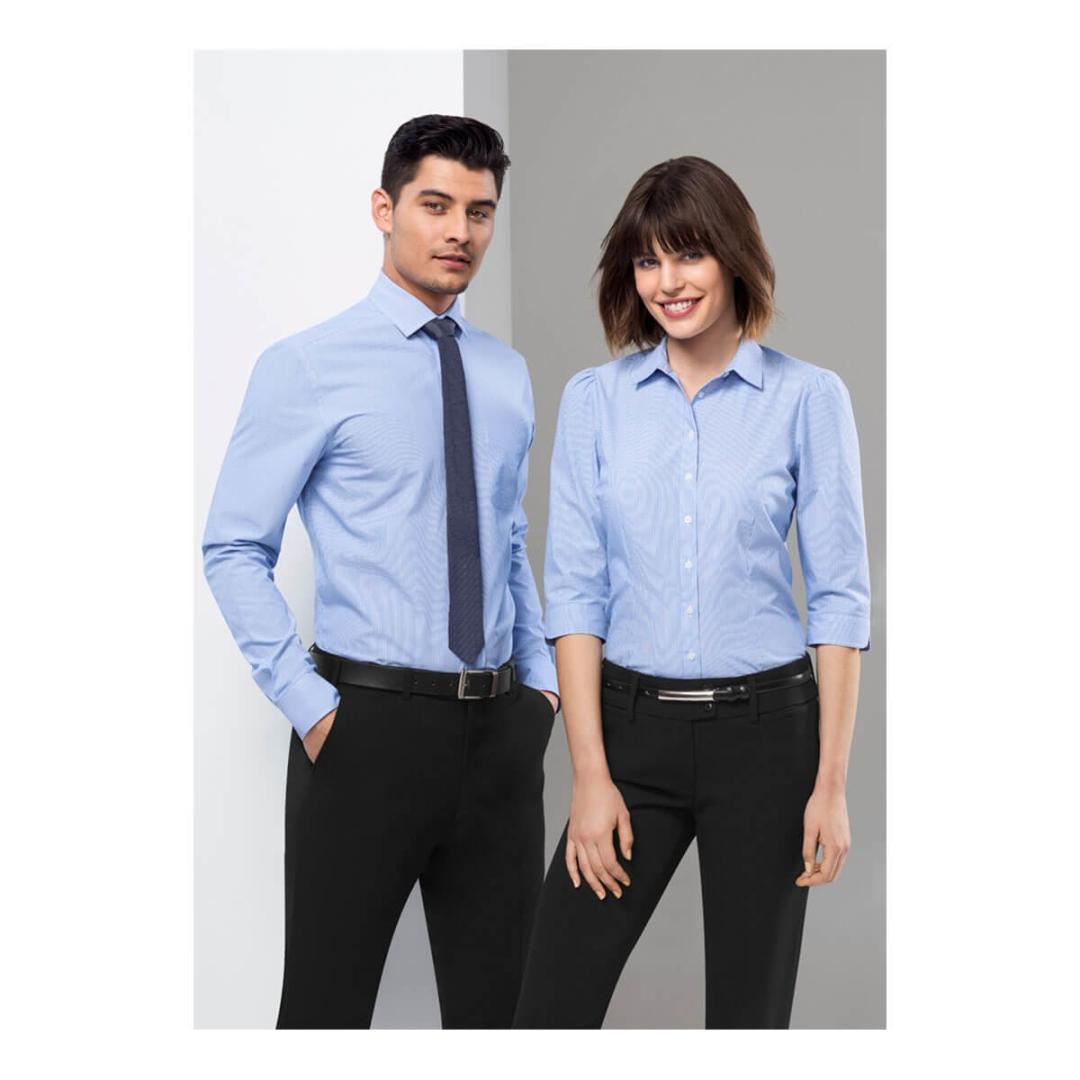 Easy Care 65% Polyester, 35% Cotton Yarn dyed fine stripe fabric UPF rating – Very Good – Modern collar, chest pocket, twin back pleats and adjustable cuff Curved hem – can be worn in or out