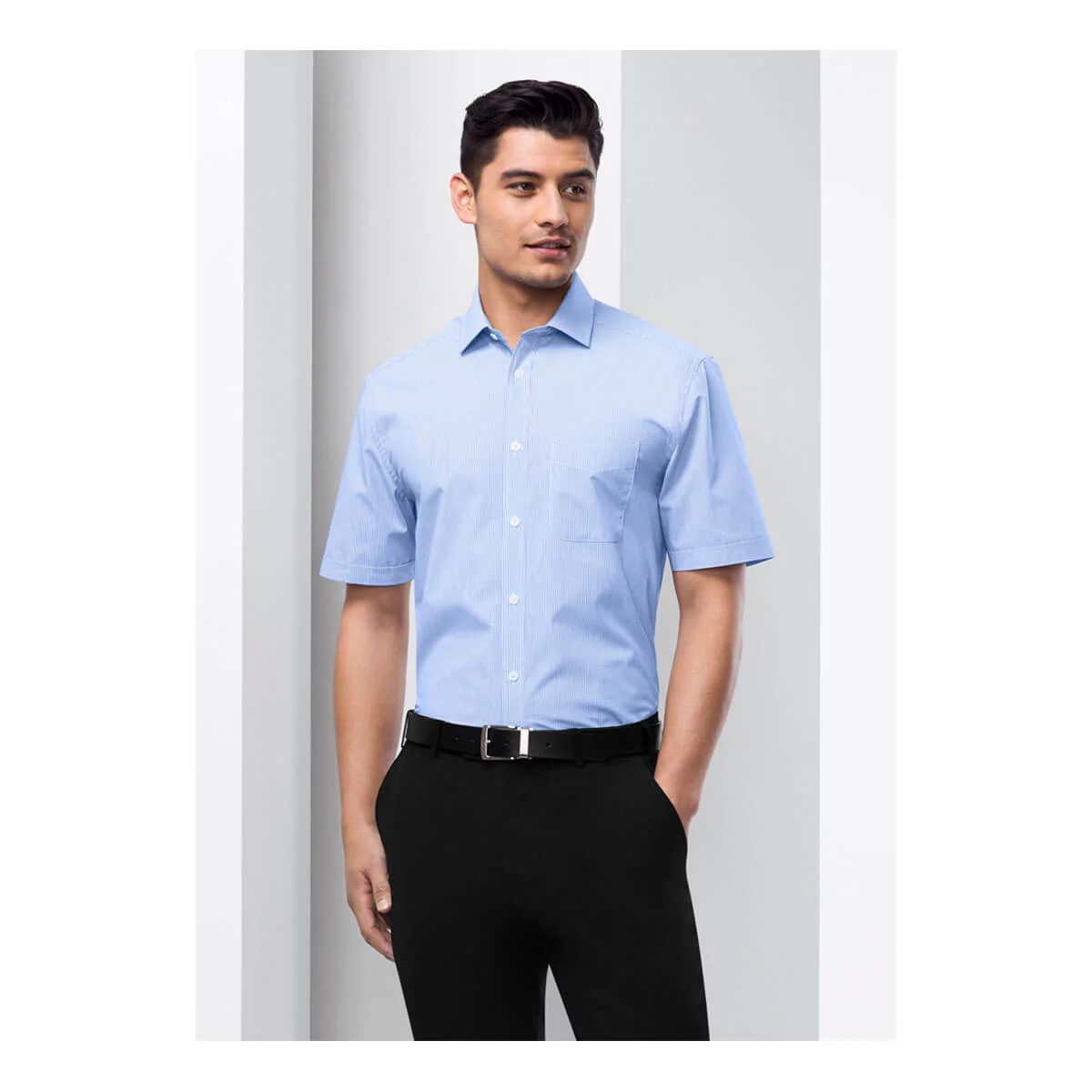Easy Care 65% Polyester, 35% Cotton Yarn dyed fine stripe fabric UPF rating – Very Good – Modern collar, chest pocket, twin back pleats and adjustable cuff Curved hem can be worn in or out