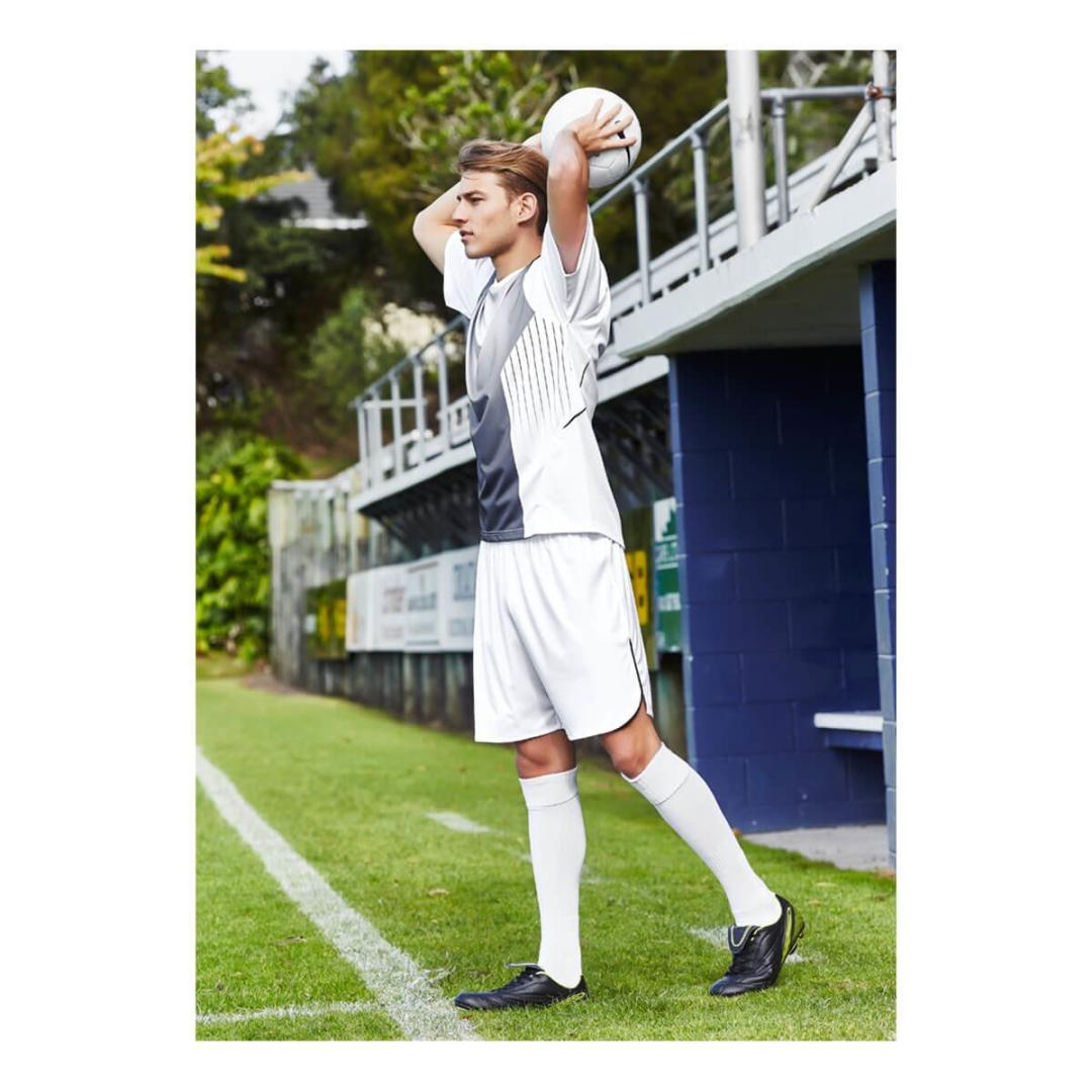 100% Breathable Polyester New stretch sports interlock fabric 155 GSM UPF rating – Excellent – Elasticised waistband with matching internal drawstring Contrast piping insert detail and side splits