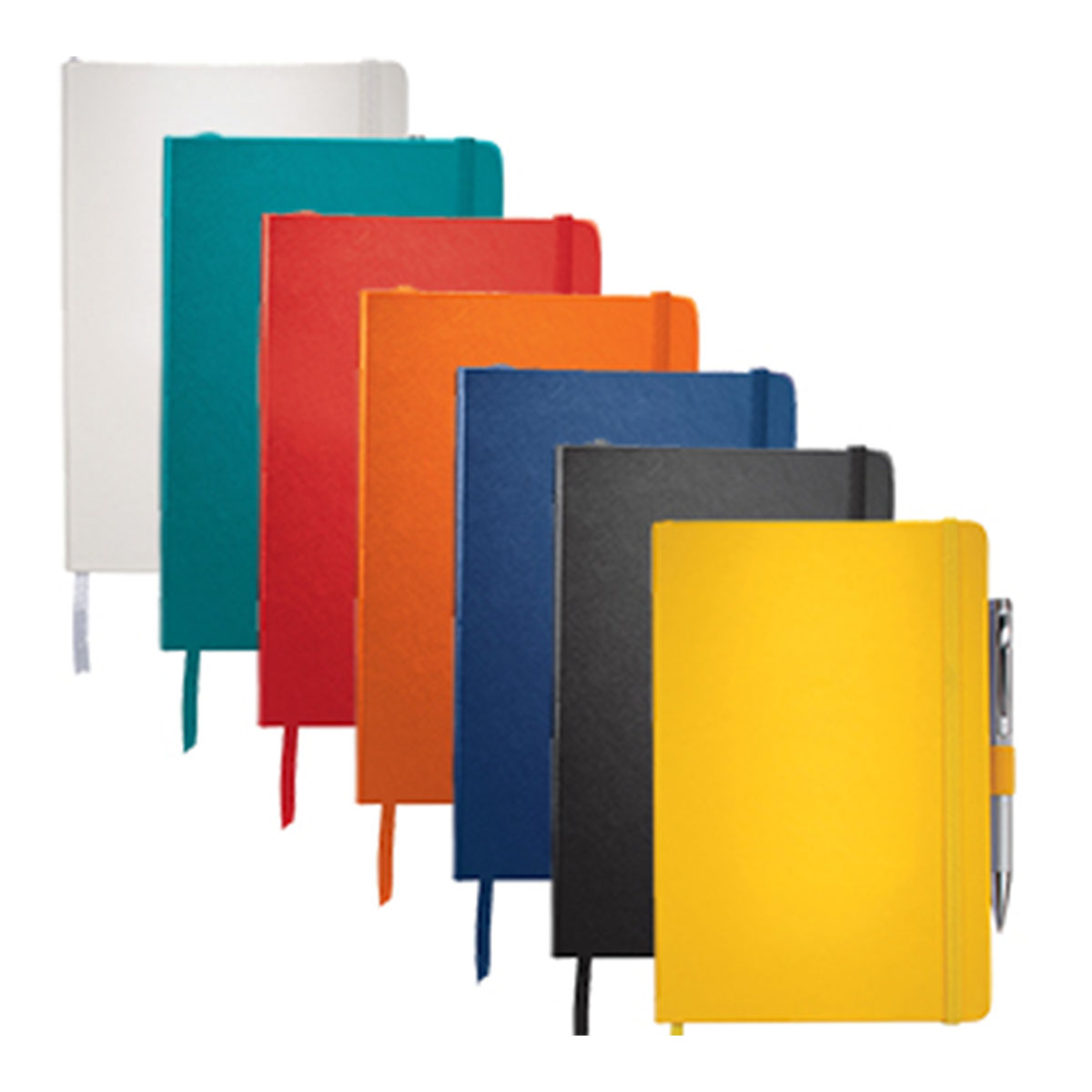 Smooth, hard cover A5 journal with built-in elastic closure. Includes 96 sheets of lined white coloured paper. Available in 7 colours.