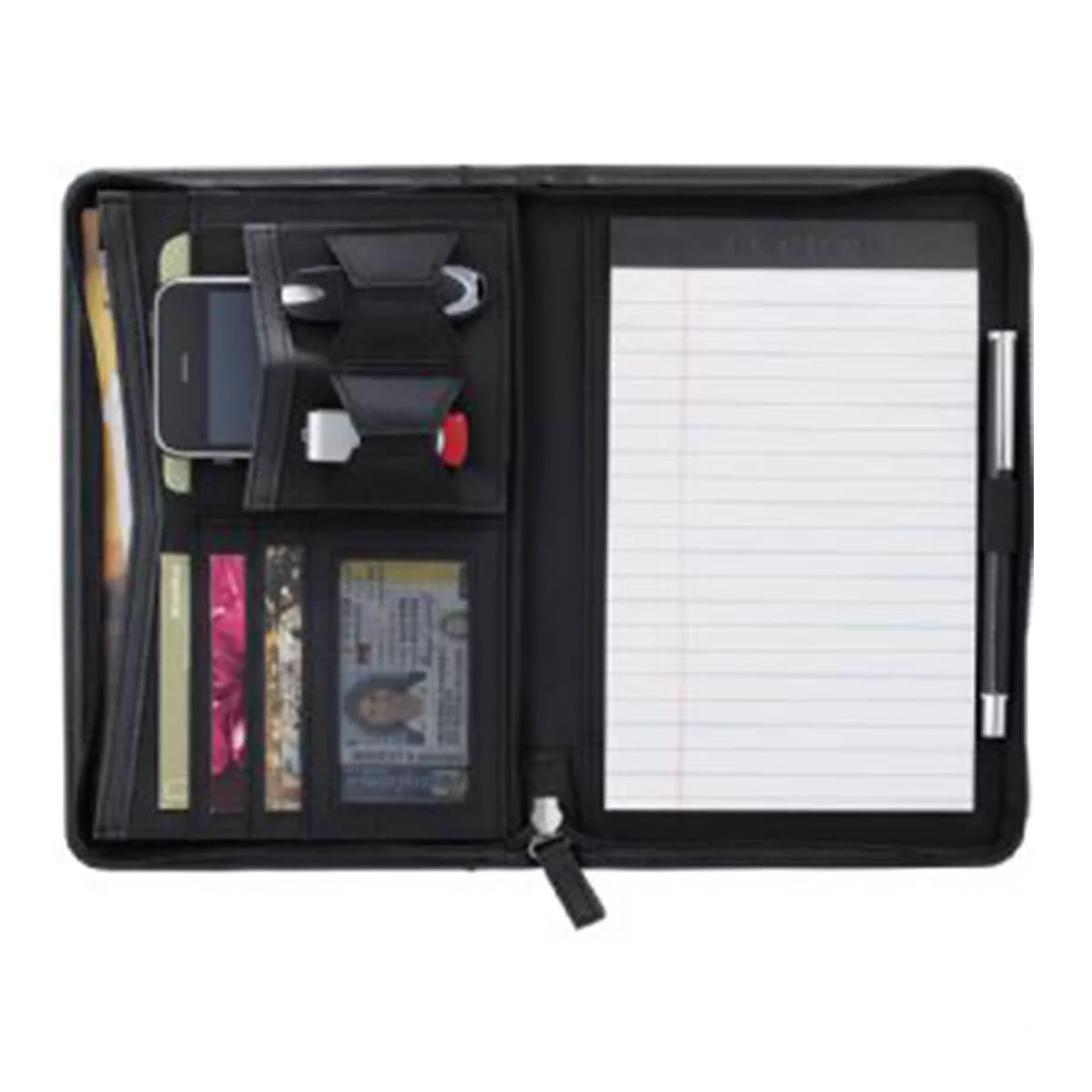 Zippered closure. Gusseted document pocket. Pen loop. Three business card holders. Two USB memory flash drive holders.