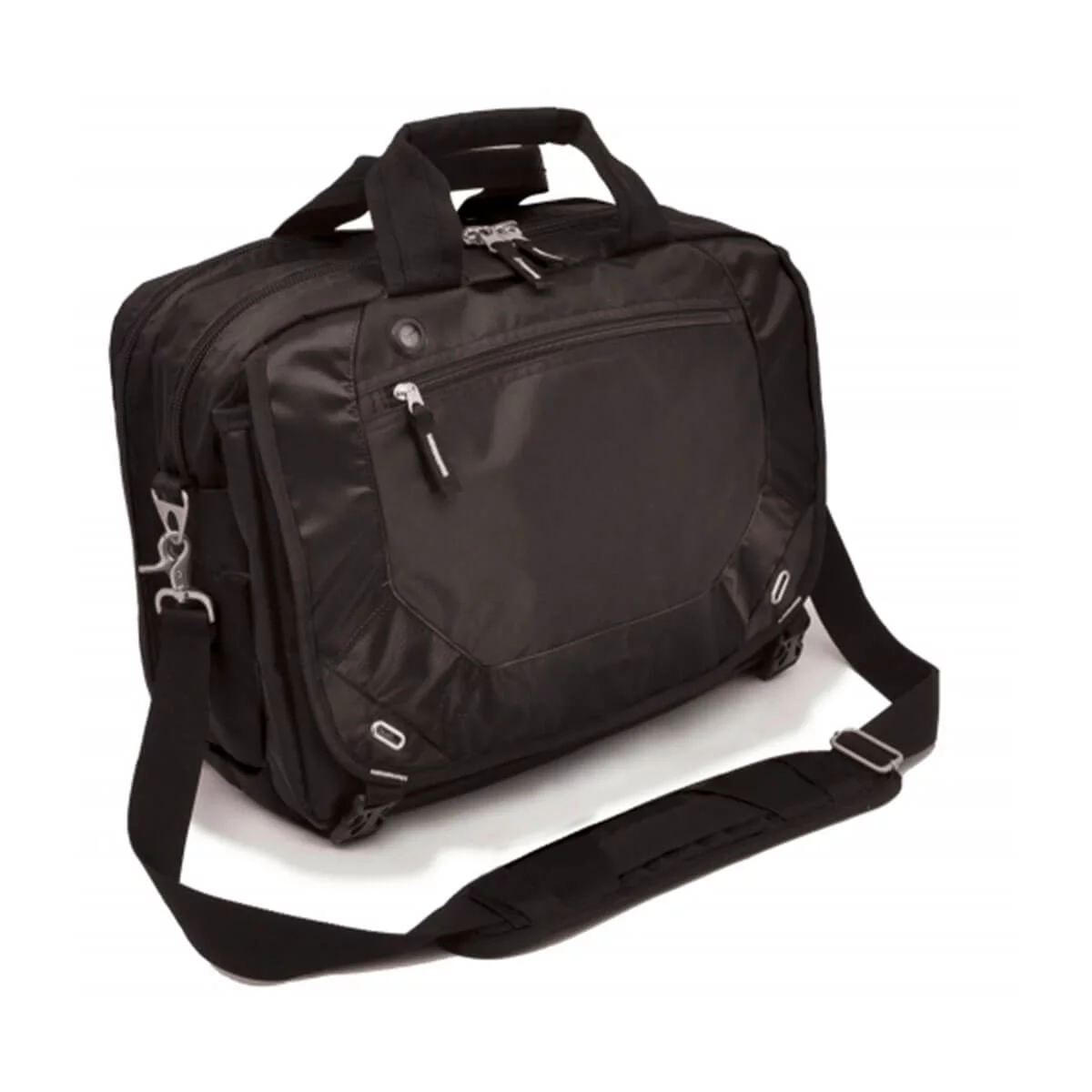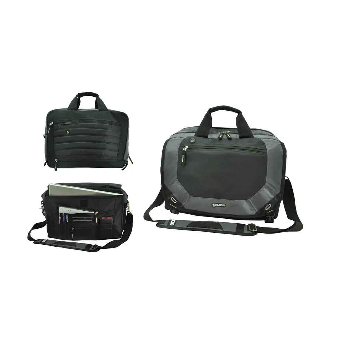 Large main zippered compartment, with 3 inside open pockets, Second main zippered compartment with file divide, Padded laptop pocket with organizer under the front flap with double buckle closure, Front zippered pocket with internal mesh pocket and hidden hole for earphone, Elasticised neoprene pocket at the right, Zip-open end pocket at back to fit over trolley handle and small open pocket, Adjustable shoulder strap with extra large pad and carry handle, Grace-Tech labeling system. Material – Textured Nylon