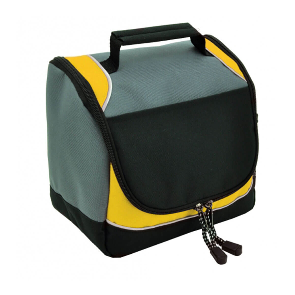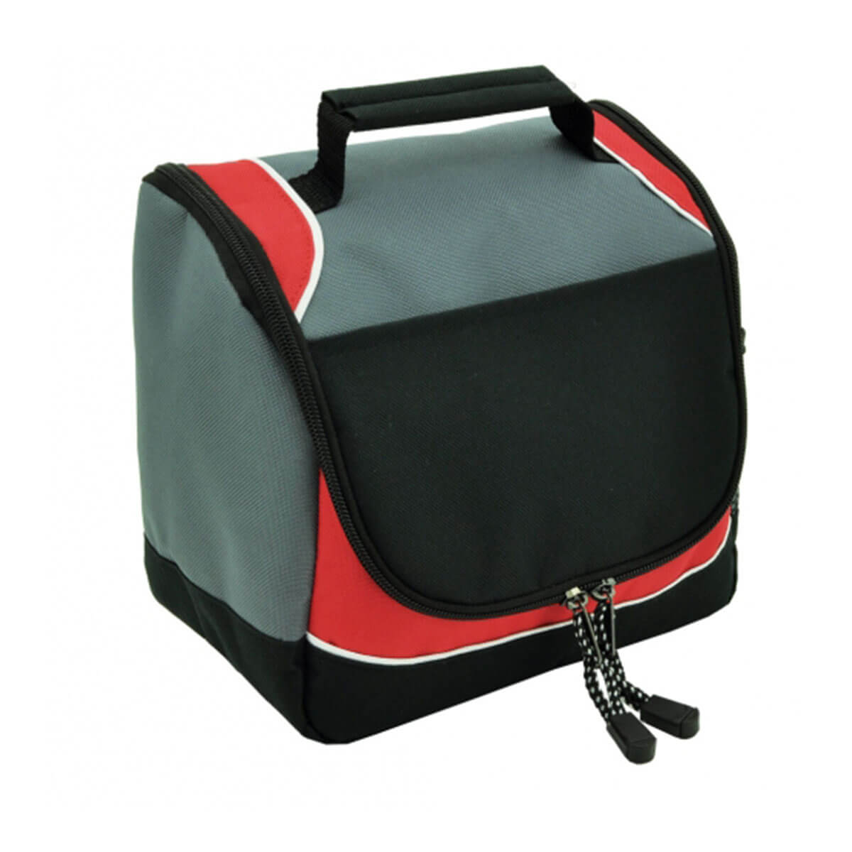 Large main zippered compartment, Front open pocket, One mesh pocket on right side, Carry handle. Material – 600 Denier Nylon with Dense Foam Insulation