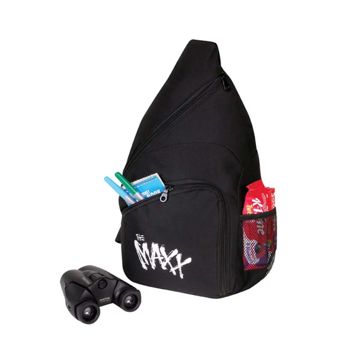 Main compartment with zippered closur, One front zippered pocket, One elasticised mesh pocket on one side, Single adjustable straps. Material – 600 Denier Nylon