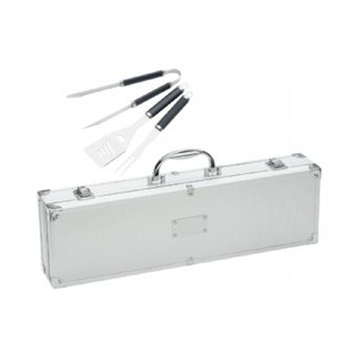 Stainless steel BBQ utensils with rubber grip handles for easy use. The aluminium case is supplied with a metal badge suitable for decorating.
