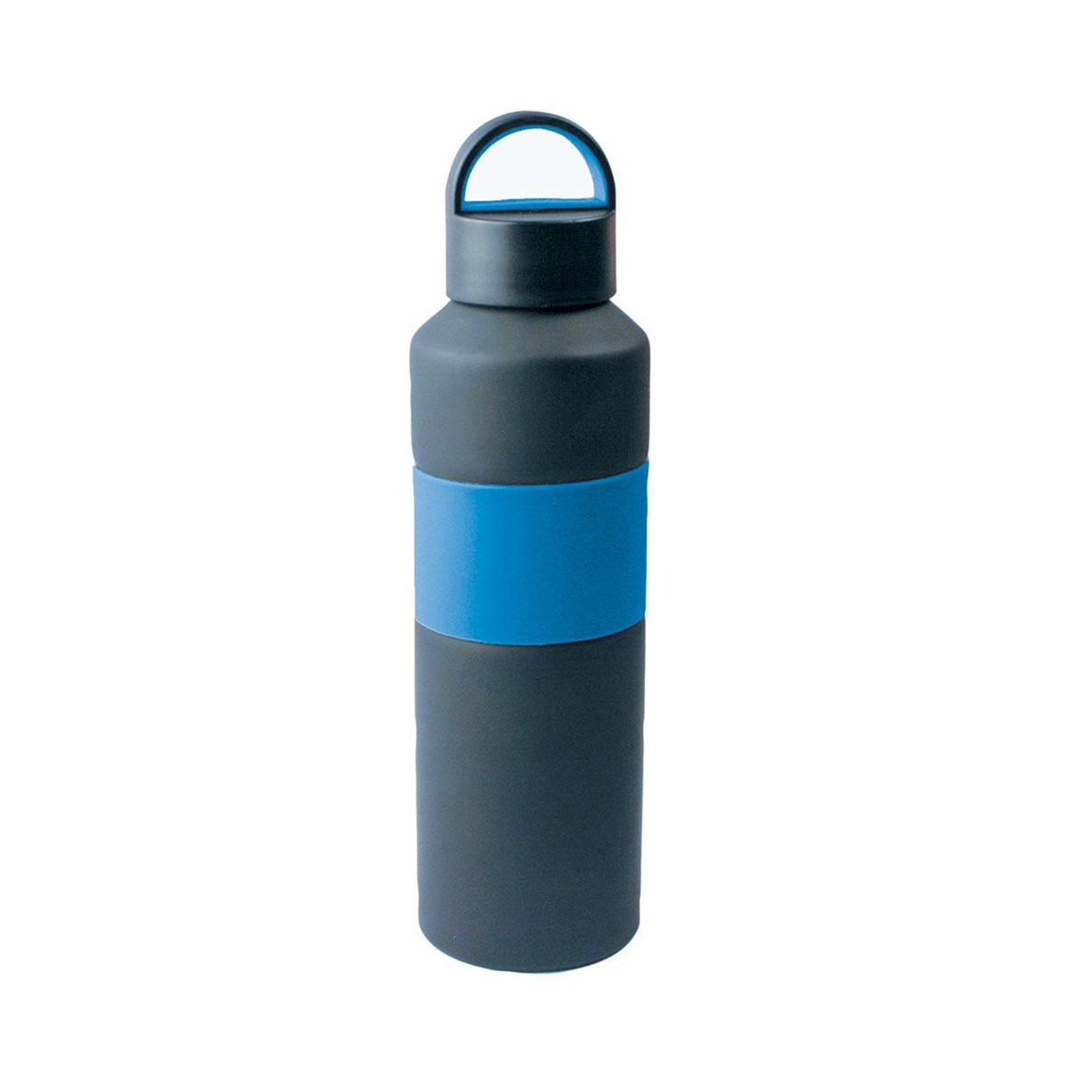 This aluminium drink bottle has a black painted finish with coloured rubber band.