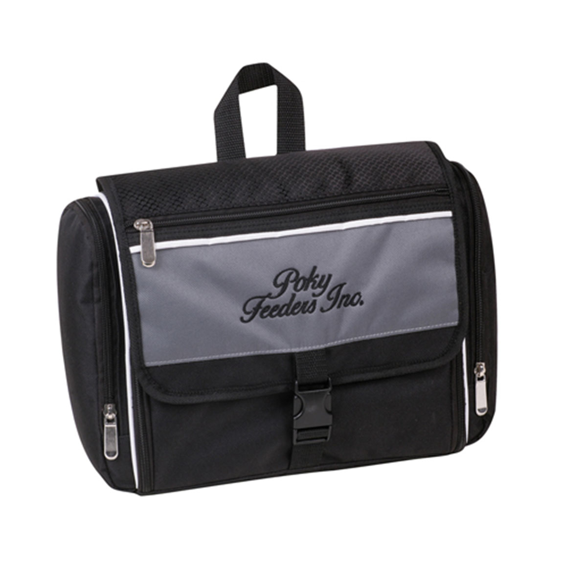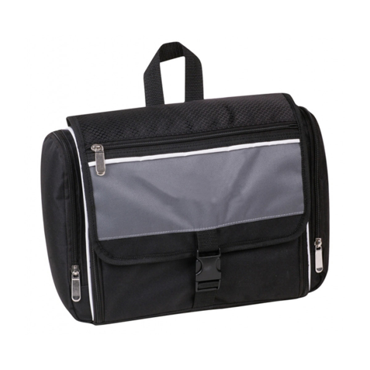 Main compartment with zipper open to hold toiletry items, Large front flap with zippered pocket and single buckle closure, Zippered pocket on both sides, Carry handle. Material – 600 Denier Nylon and Honeycomb Textured