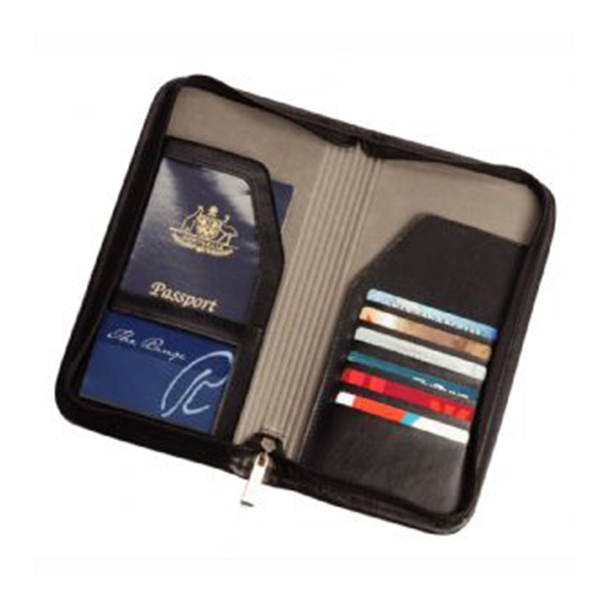 Zippered travel wallet made from black koskin material with grey EVA interior