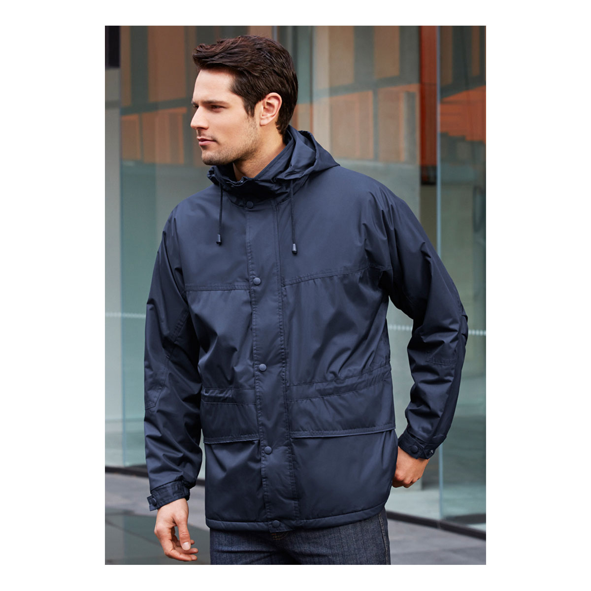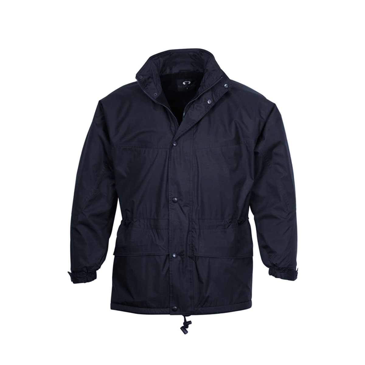 Outer: 100% Polyester Seamsealed Shell Lining: Anti-pill Micro Fleece – High wind collar with hidden seamsealed hood Adjustable drawstrings around waist and bottom Full zip with snap-down storm flap for added protection 2 Way front pockets – zippered top and side hand-warmer pocket Elasticated/snap down sleeve cuff with adjustable tab Zippered inside left chest pocket Inside zip access for embroidery Available in Black and Navy only